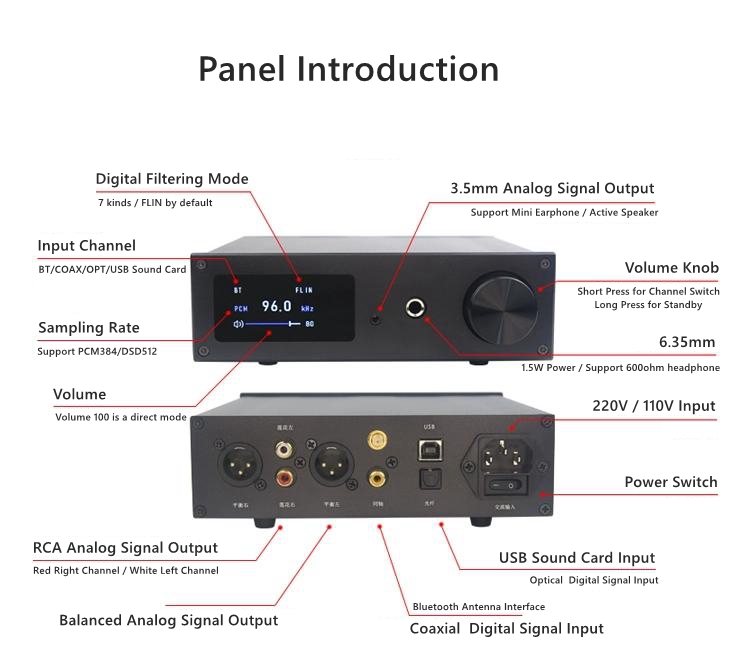 - Output interface: balanced/RCA (output level 2Vrms), 3.5/6.35 (headphone amplifier power 1.5W)