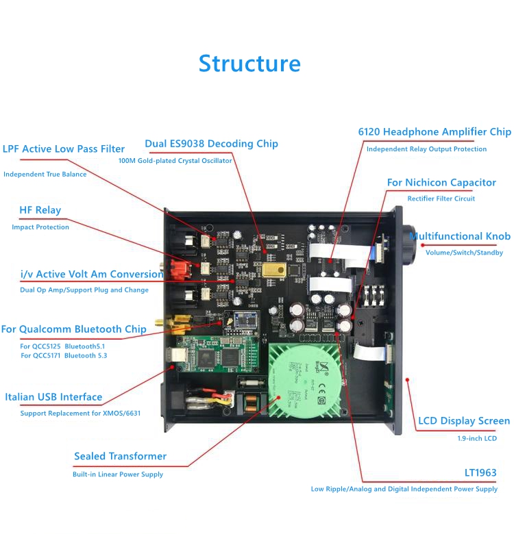 - Decoding chip: ES9038Q2M x 2