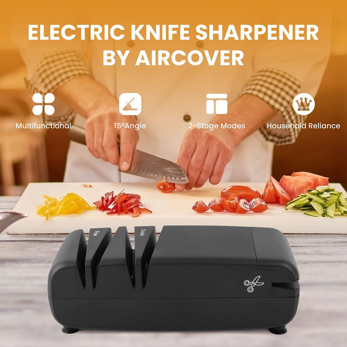 -  AirCover electric knife sharpener secures you a convenient and professional sharpening experience at home. Making it easier for sharpen your straight-edge kitchen set, hunting knife, folding pocket blade, and scissors.