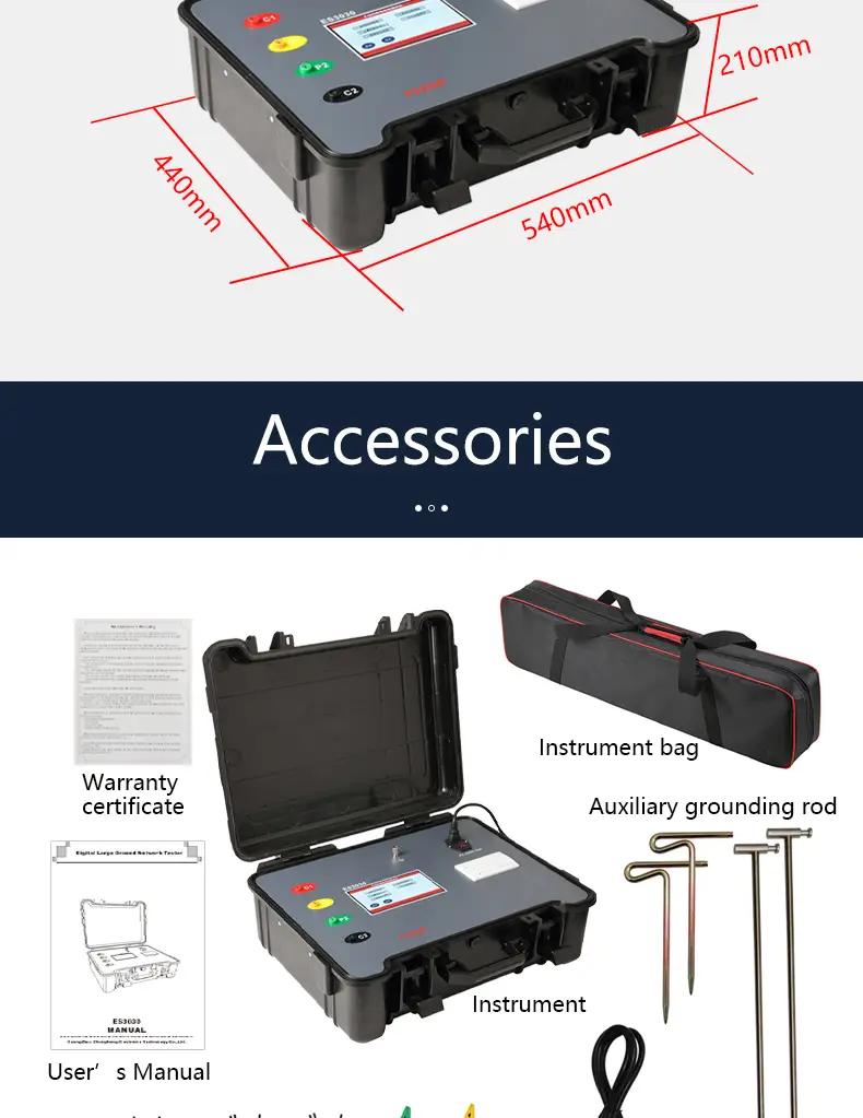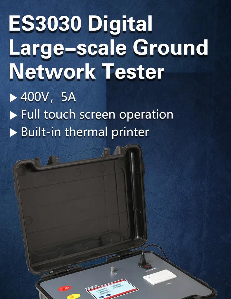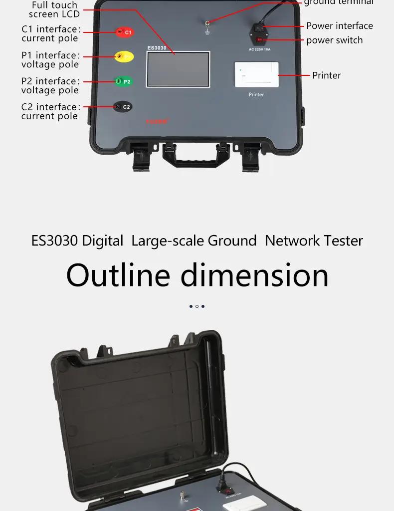- ES3030 digital large Grounding Resistance Tester consists of a host computer, test leads, and grounding rods. It has functions such as reading, reviewing, saving, and printing historical data.