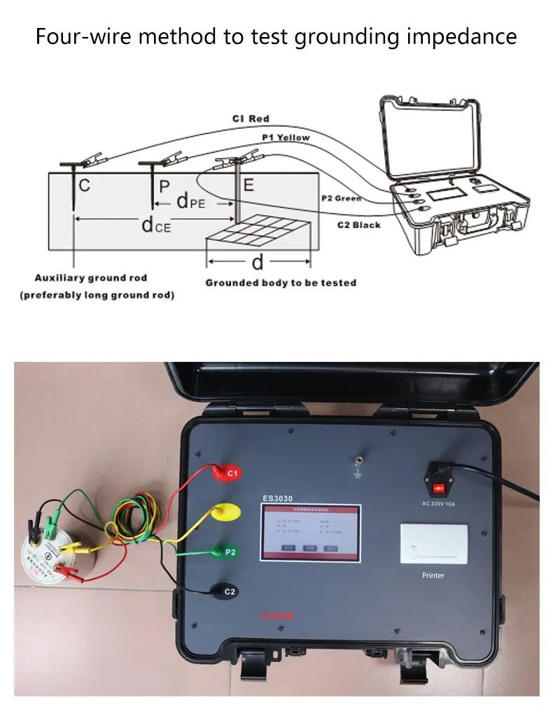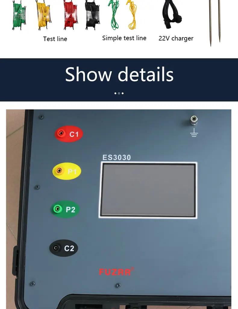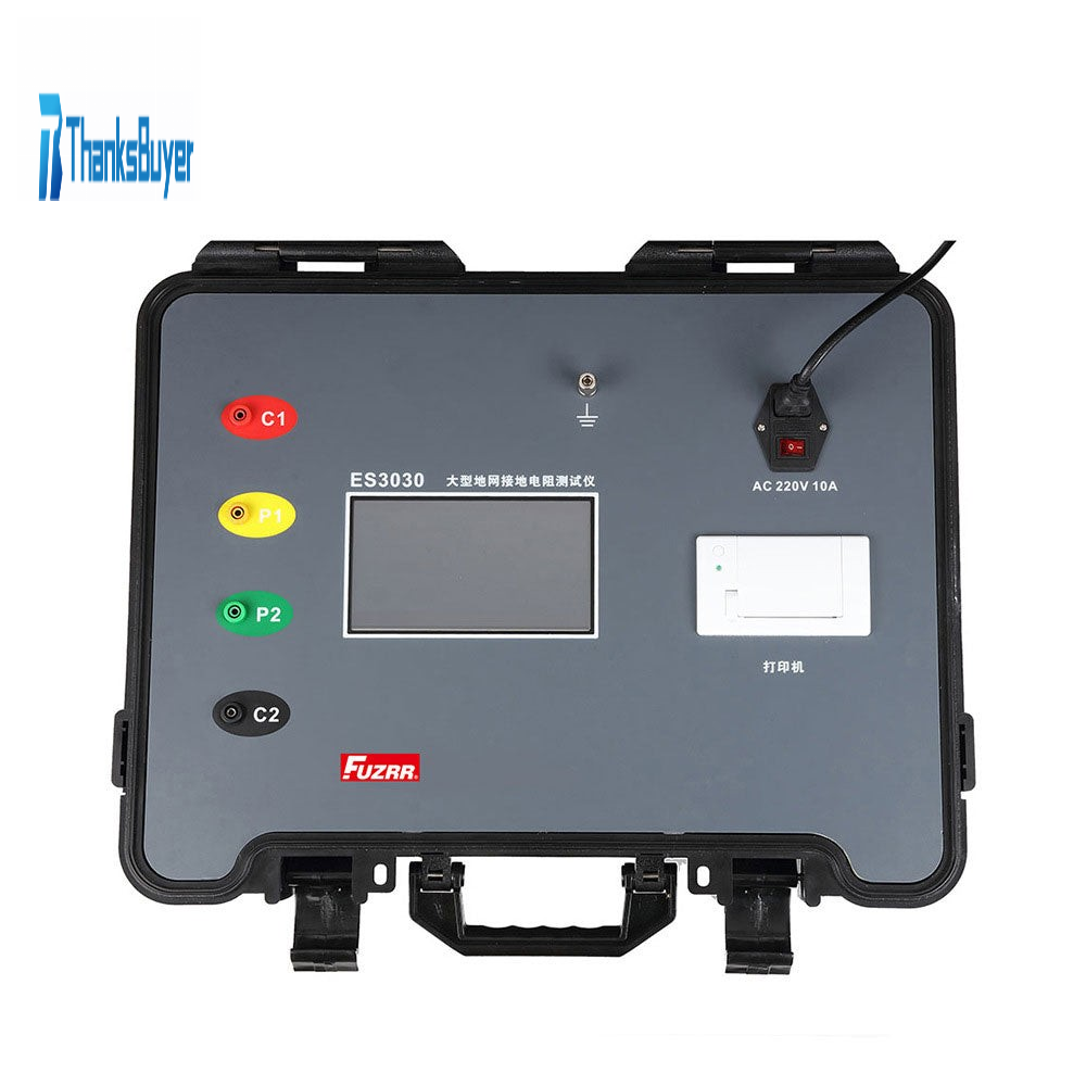 - ES3030 digital large-scale grounding grounding resistance tester, also known as power frequency grounding resistance tester, grounding resistance meter, etc. are common instruments for testing and measuring common grounding resistance meters. It adopts new variable frequency AC power supply, dual frequency measurement technology, large touch color screen and microprocessor technology to meet the requirements of two-wire, three-wire and four-wire test impedance. It can also measure soil resistivity, step voltage, distribution potential and contact voltage, current phase angle and other parameters. Applicable to telecommunications, electric power, meteorology, computer room, oil field, power distribution line, iron tower transmission line, gas station, factory grounding grid, lightning rod, etc., in line with the standards of power substation and lightning protection equipment testing instruments. The instrument test is accurate, fast, simple, stable and reliable.