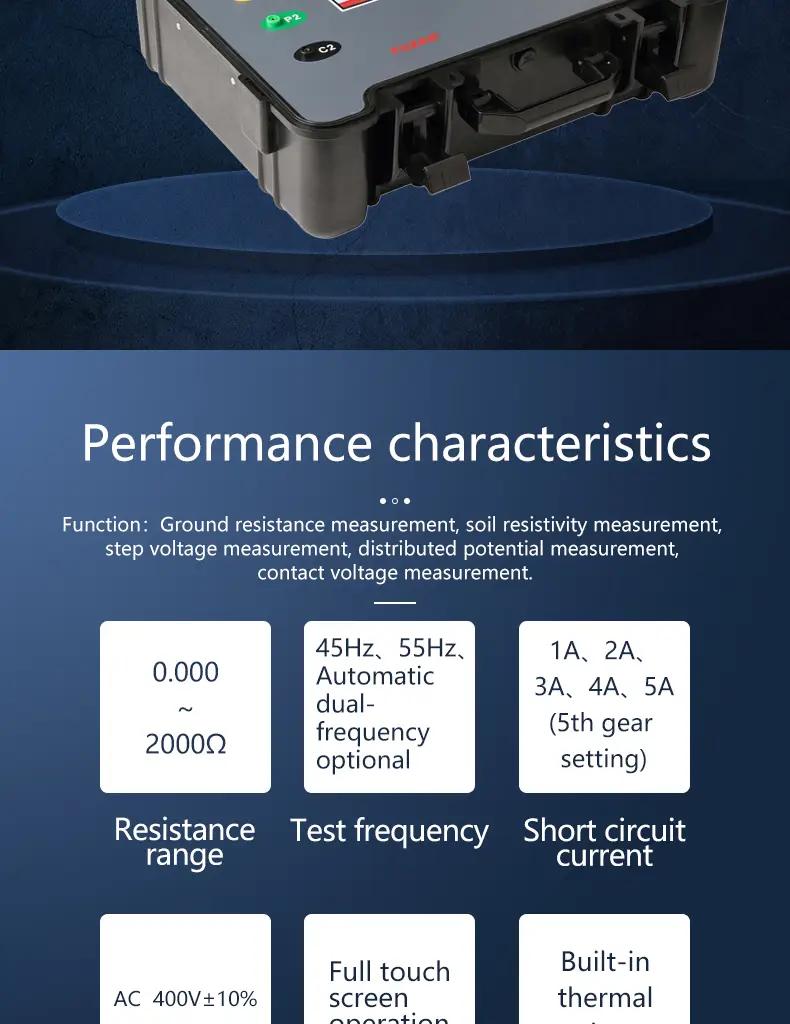 - Function: Ground resistance measurement, soil resistivity measurement, step voltage measurement, distributed potential measurement, contact voltage measurement