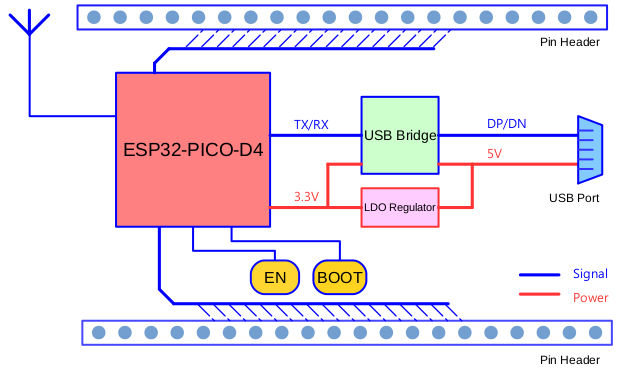 The block diagram below shows the main components of ESP32-PICO-KIT and their interconnections.