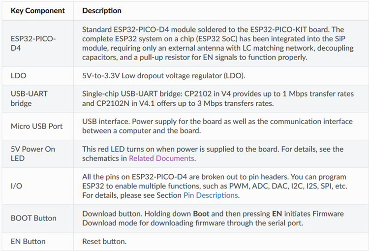 This particular description covers ESP32-PICO-KIT V4 and V4.1. The difference is the upgraded USB-UART bridge from CP2102 in V4 with up to 1 Mbps transfer rates to CP2102N in V4.1 with up to 3 Mbps transfer rates.