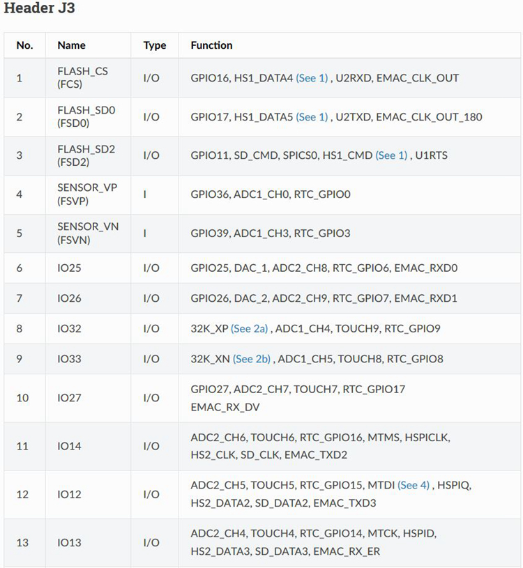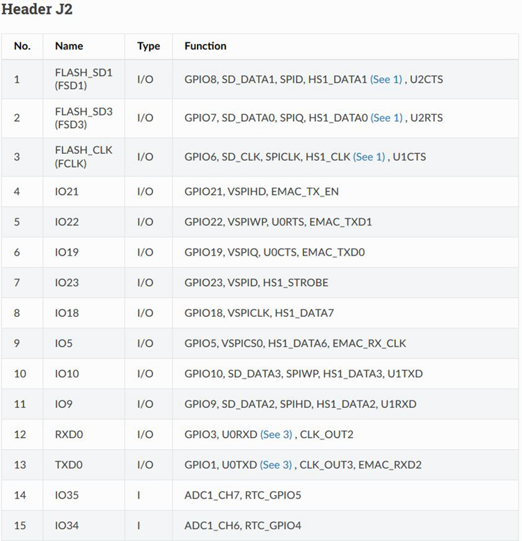 The two tables below provide the Name and Function of I/O header pins on both sides of the board, see ESP32-PICO-KIT board layout. The pin numbering and header names are the same as in the schematic given in Related Documents.