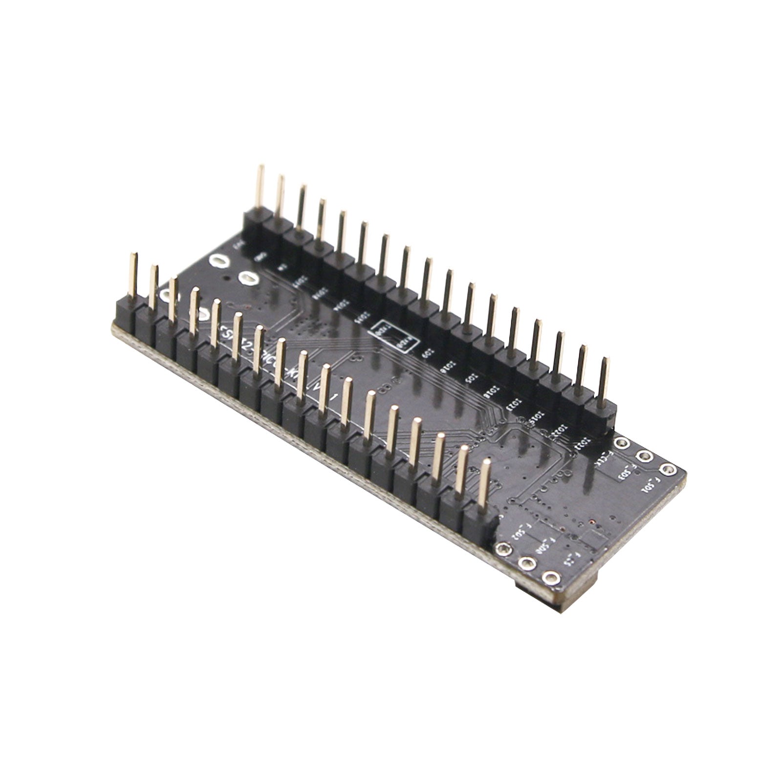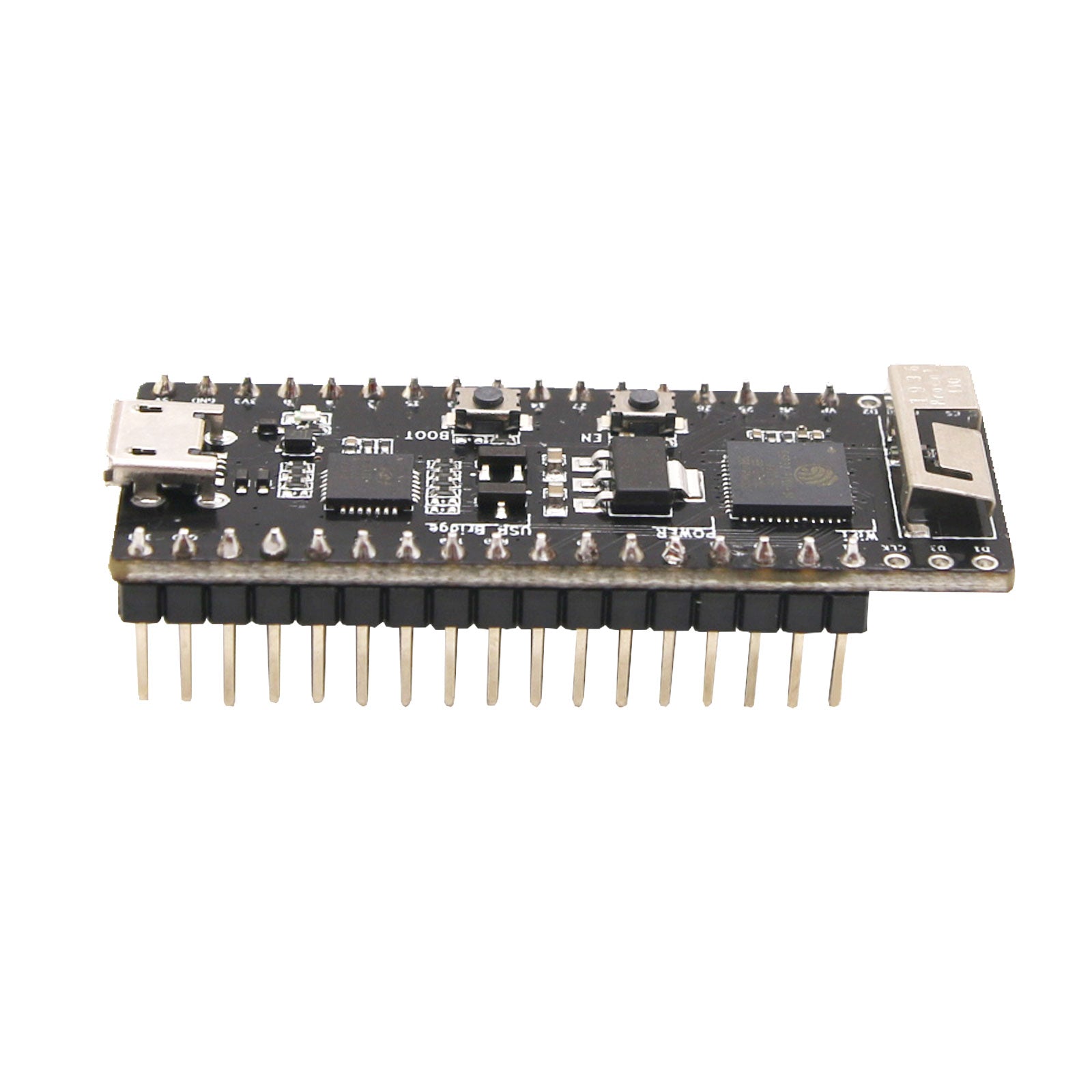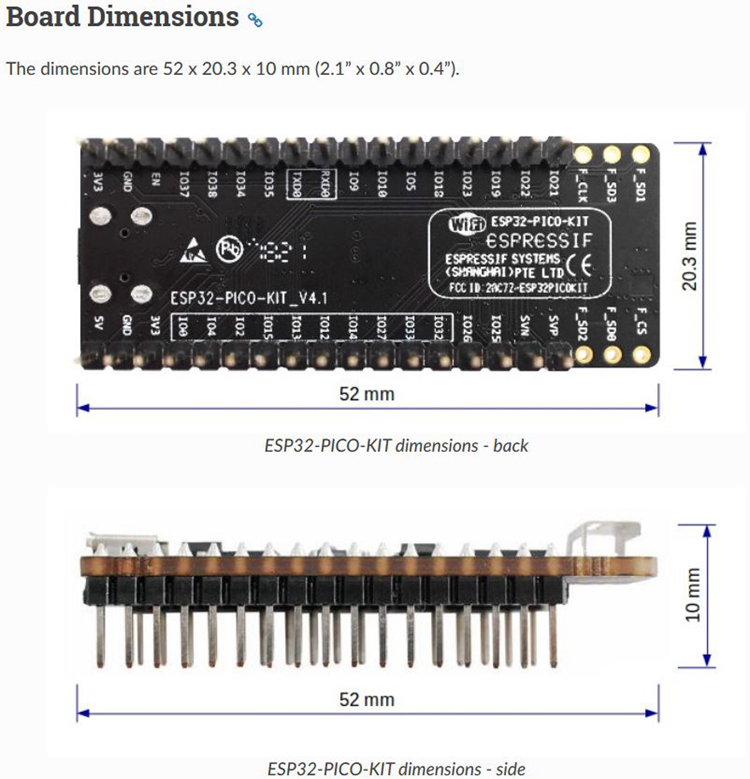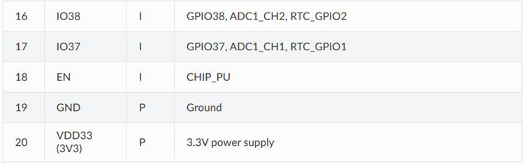 All the IO signals and system power on ESP32-PICO-D4 are led out to two rows of 20 x 0.1" header pads on both sides of the development board for easy access. For compatibility with Dupont wires, 2 x 17 header pads are populated with two rows of male pin headers. The remaining 2 x 3 header pads beside the antenna are not populated. These pads may be populated later by the user if required.