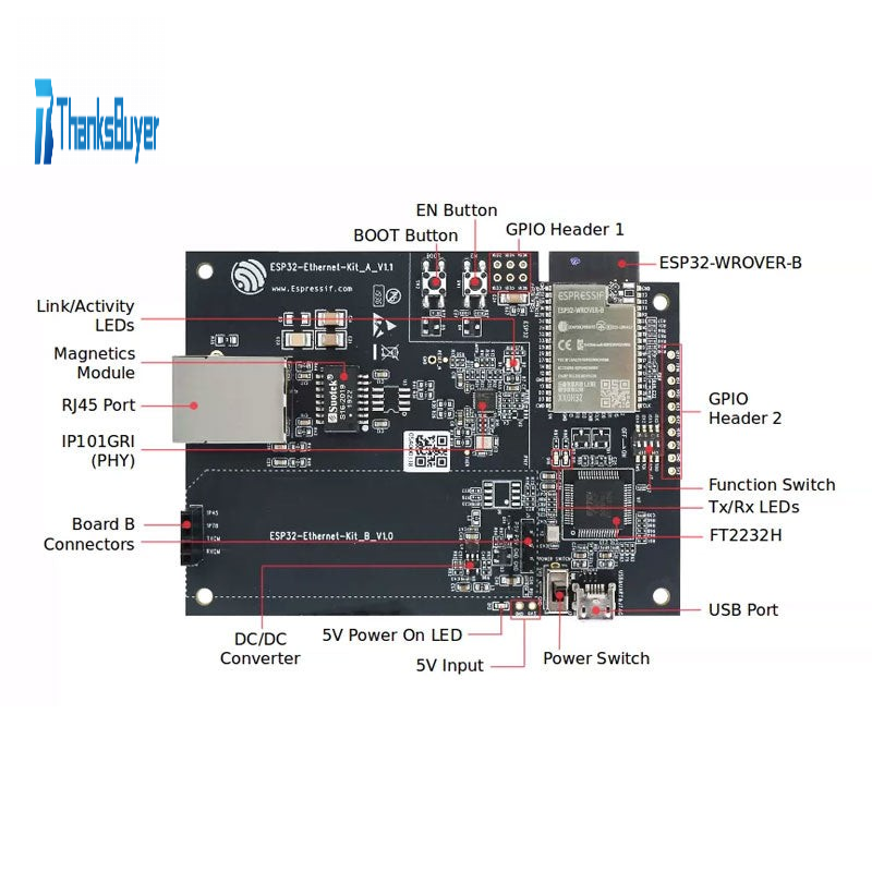 It consists of two development boards, the Ethernet board A and the PoE board B. The Ethernet board (A) contains Bluetooth/Wi-Fi dual-mode ESP32-WROVER-E module and IP101GRI, a Single Port 10/100 Fast Ethernet Transceiver (PHY). The PoE board (B) provides power over Ethernet functionality. The A board can work independently, without the board B installed.