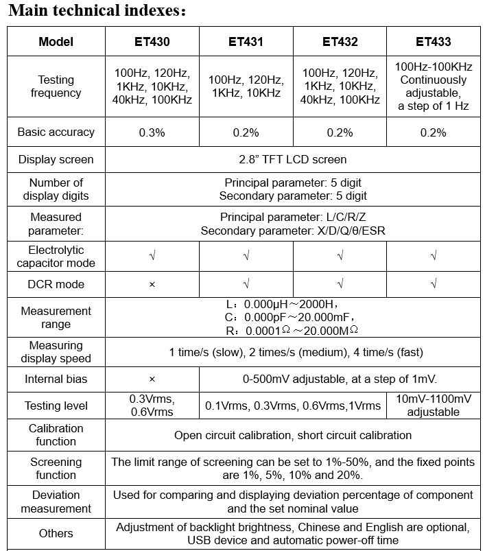 * ET432: 100kHZ, accuracy 0.2%. Internal bias, 4 level points, electrolytic capacitor and DCR measurement function