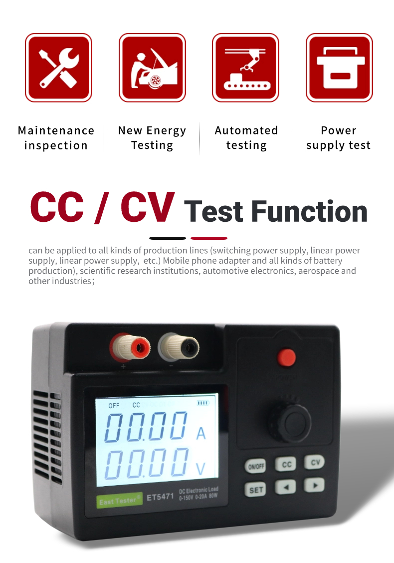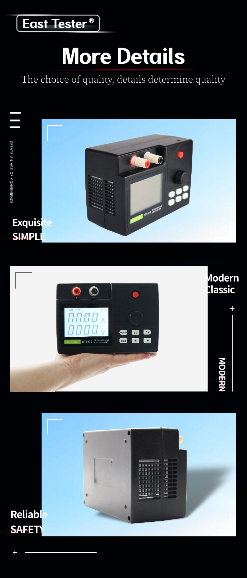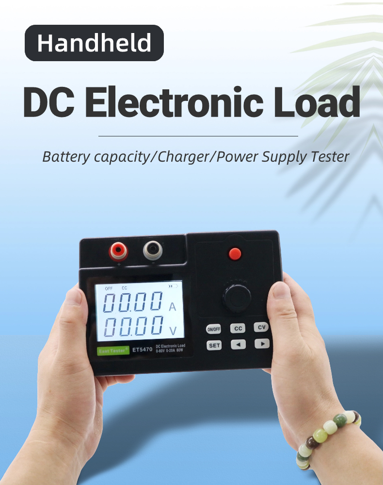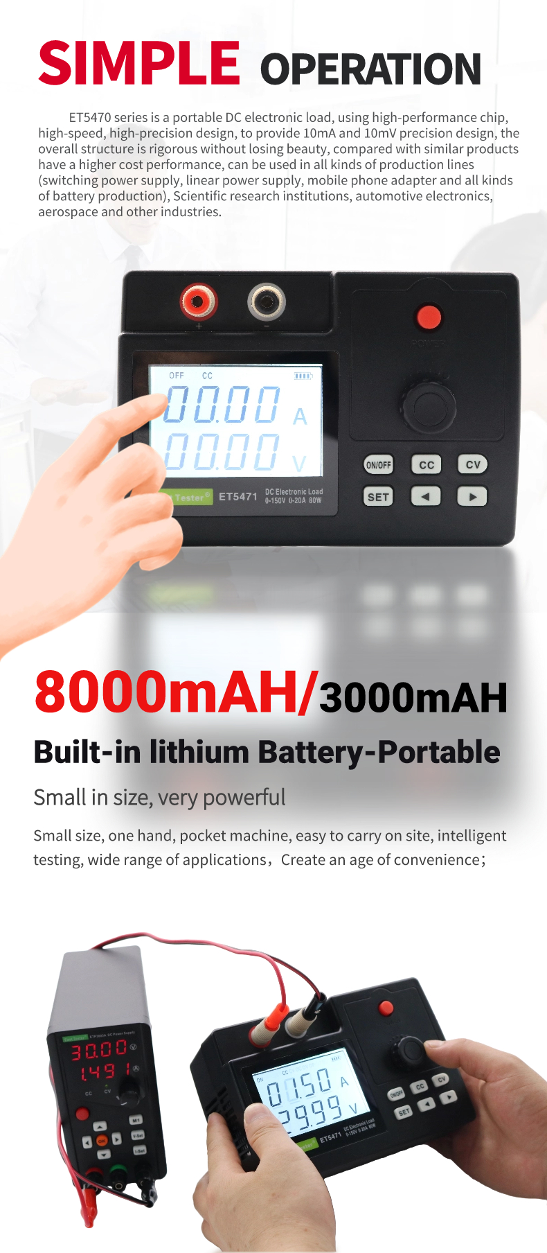 - ET5470 series DC electronic load is a portable DC electronic load, using high-performance chips, high-speed, high-precision design, to provide 10mA and 10mV precision design, the overall structure is rigorous without losing beauty, the use of advanced production technology compared to similar products have a higher cost performance, can be applied to all kinds of production lines (switching power supply, linear power supply, linear power supply, etc.) Mobile phone adapter and all kinds of battery production), scientific research institutions, automotive electronics, aerospace and other industries.