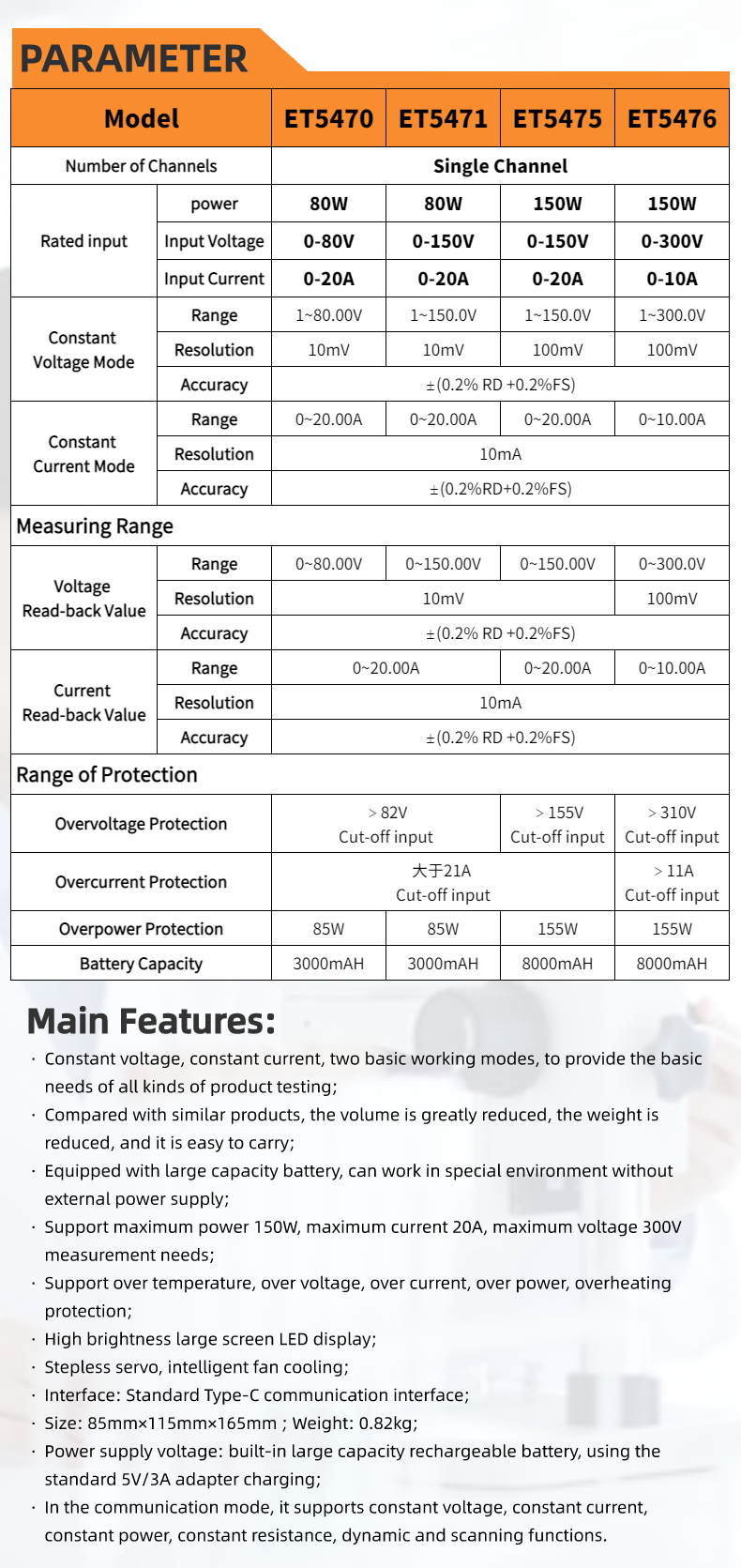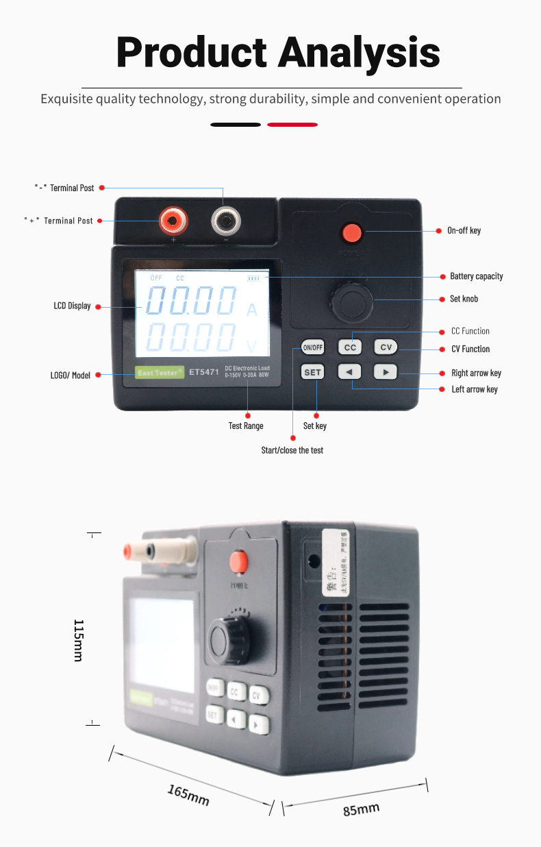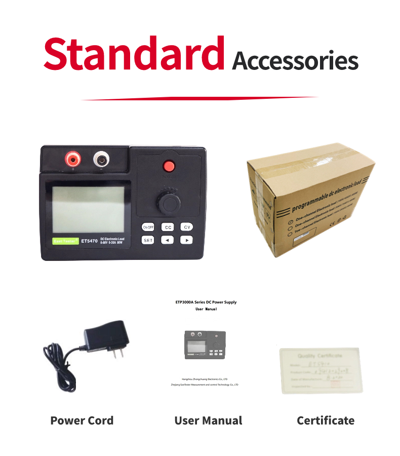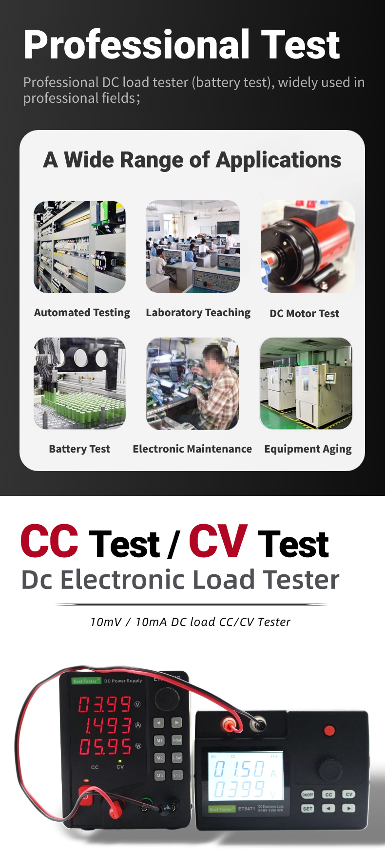 - ET5470 series DC electronic load is a portable DC electronic load, using high-performance chips, high-speed, high-precision design, to provide 10mA and 10mV precision design, the overall structure is rigorous without losing beauty, the use of advanced production technology compared to similar products have a higher cost performance, can be applied to all kinds of production lines (switching power supply, linear power supply, linear power supply, etc.) Mobile phone adapter and all kinds of battery production), scientific research institutions, automotive electronics, aerospace and other industries.