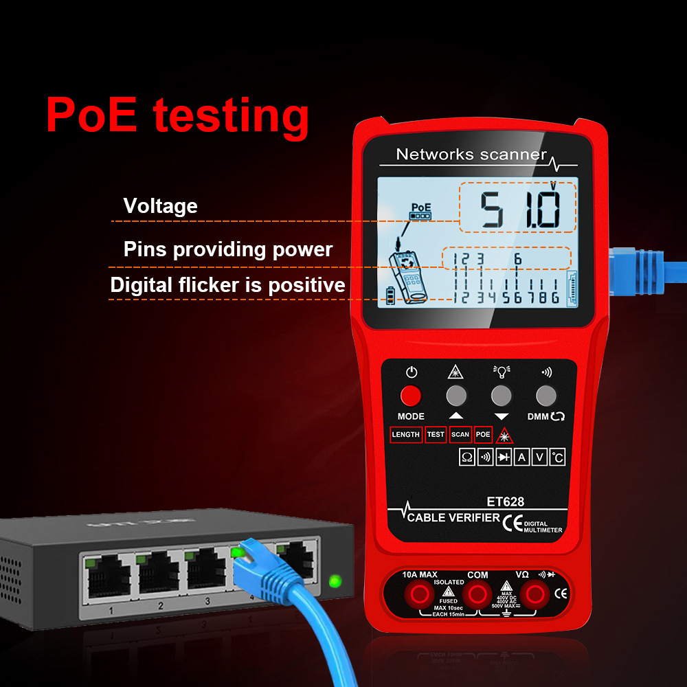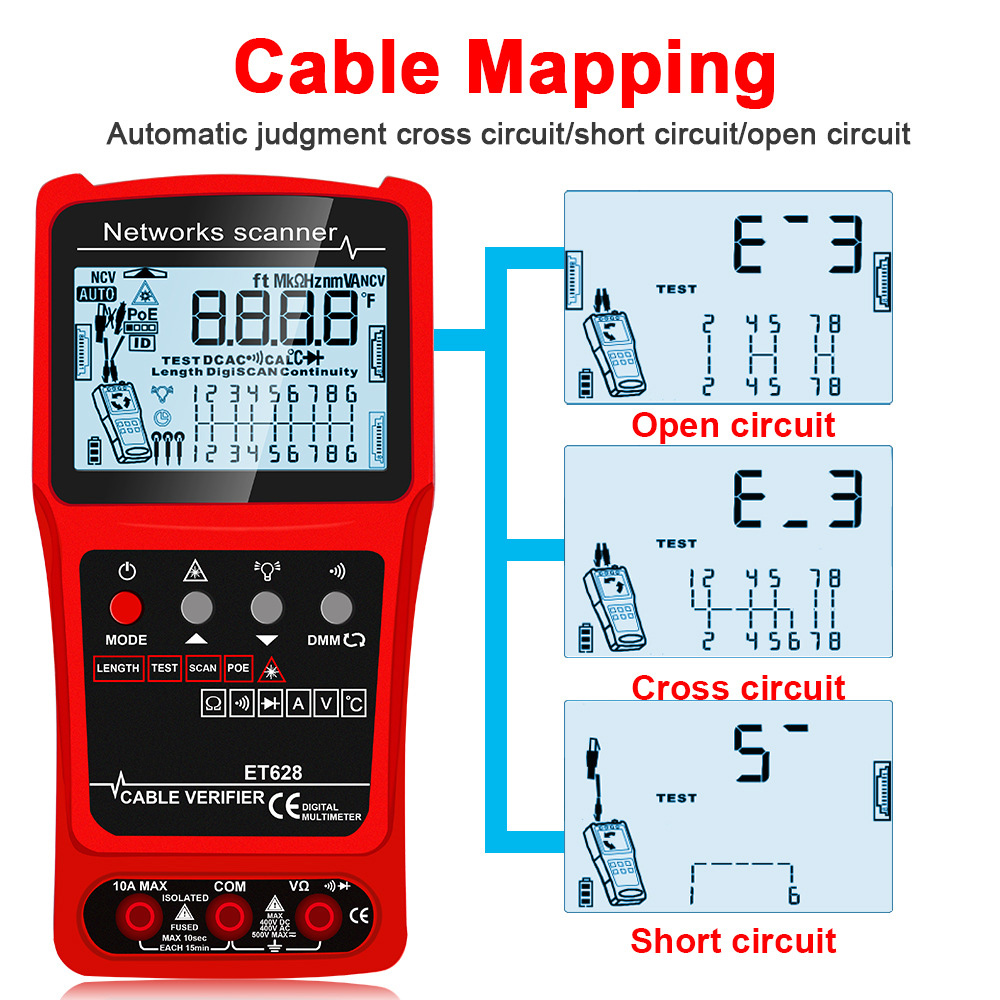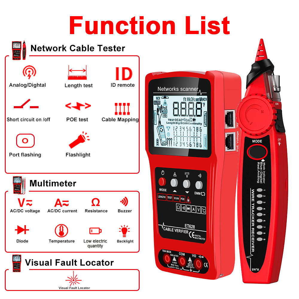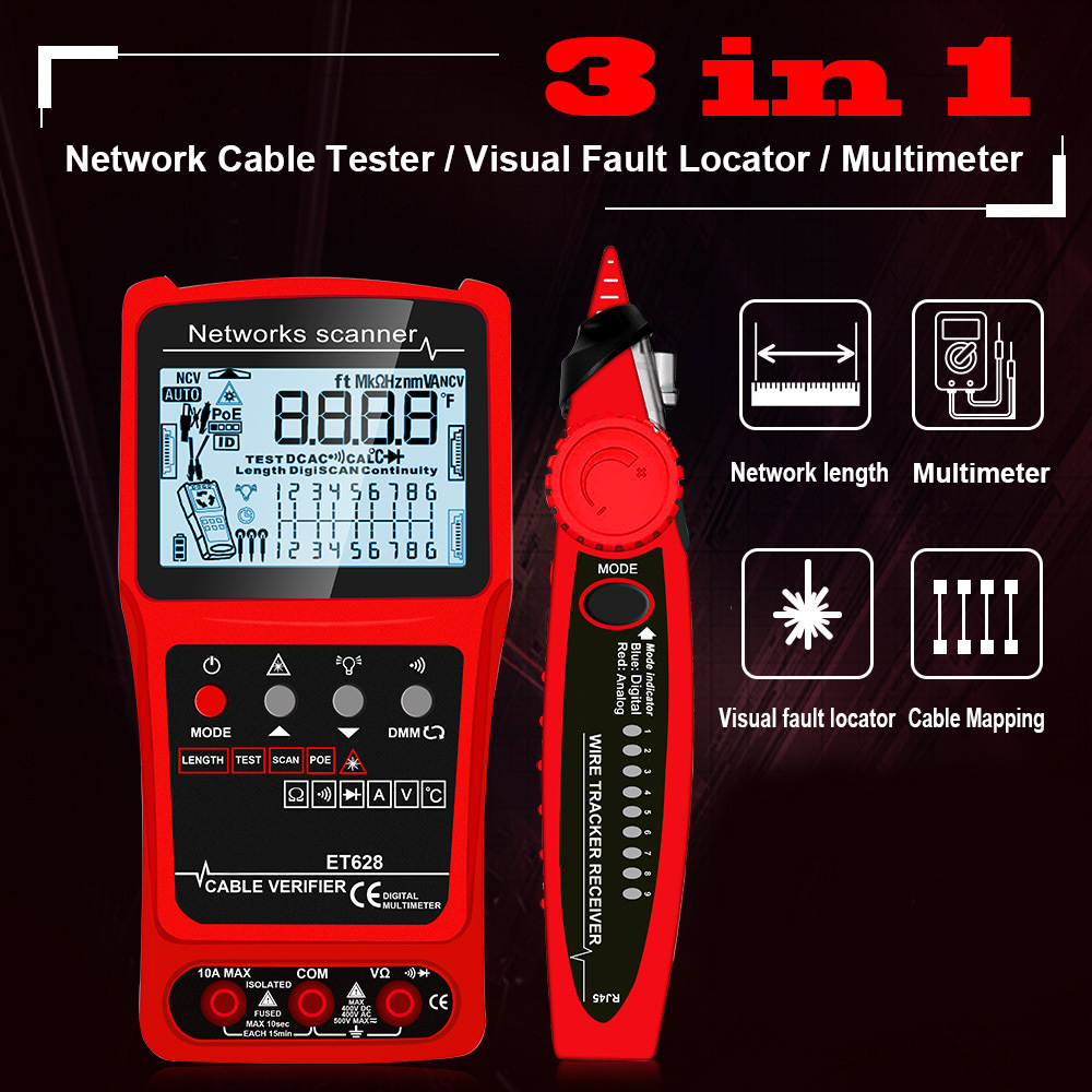 ET628 3-in-1 Multimeter Network Cable Tester Visual Fault Locator Kit with K-Type Temperature Probe