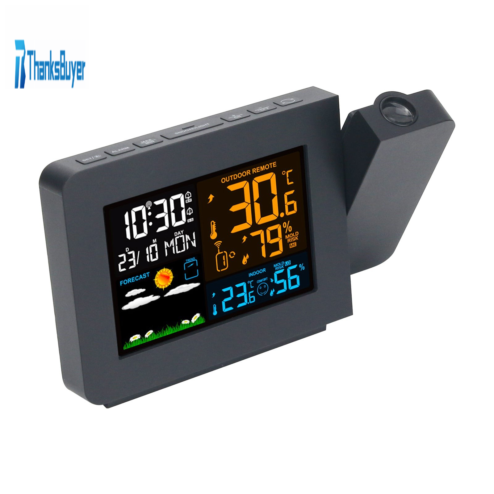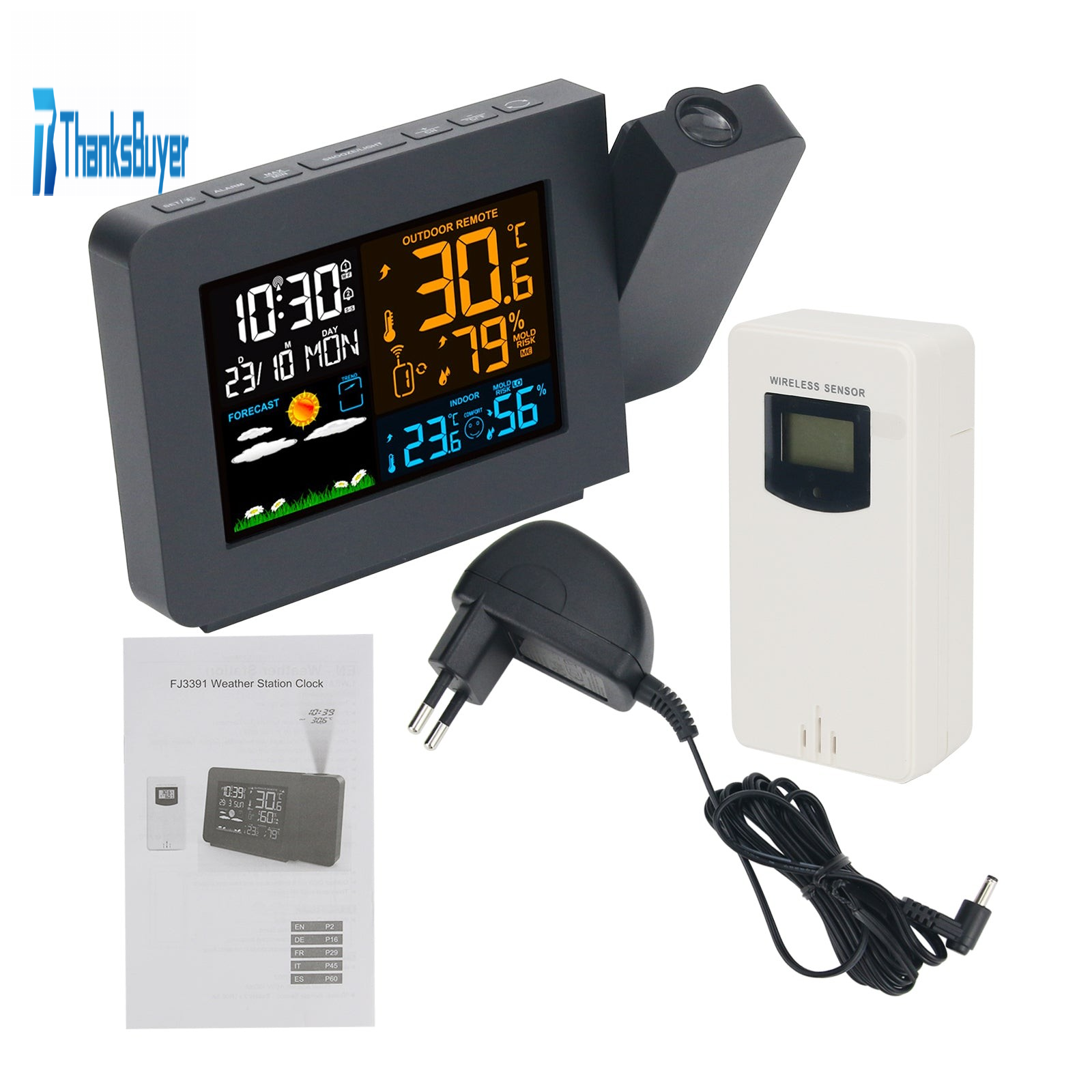 FanJu FJ3391 Weather Station Projection Clock Alarm Clock For Indoor Outdoor Temperature Humidity