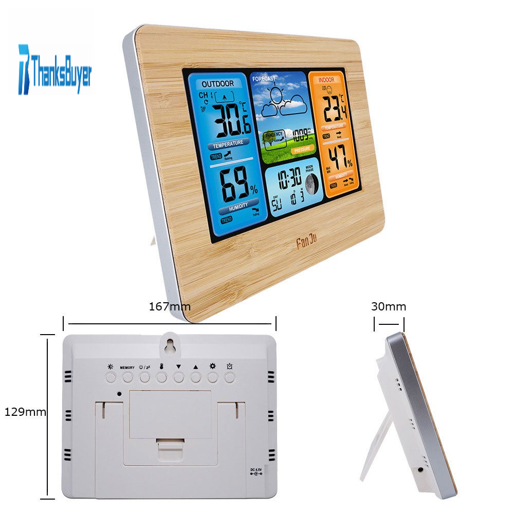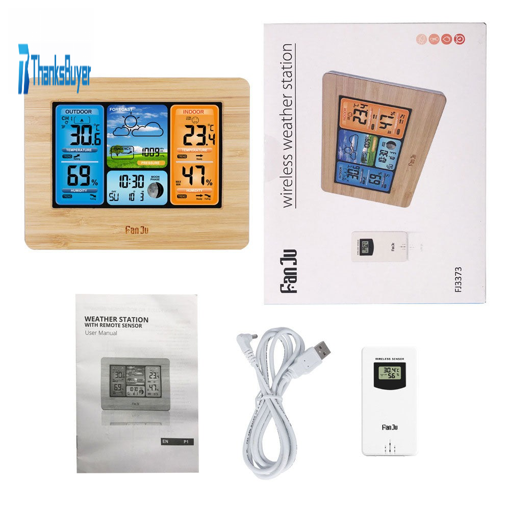 - FanJu FJ3373 multi-function digital weather station alarm clock. With a thermometer, hygrometer and barometer, configure a wireless sensor. These data can be used to predict weather conditions in the future. It not only lets you know the time and calendar, but also helps you in your life. Suitable for a variety of locations, whether you are on the table or on the wall. Simple and modern design is a great tool and home decor.