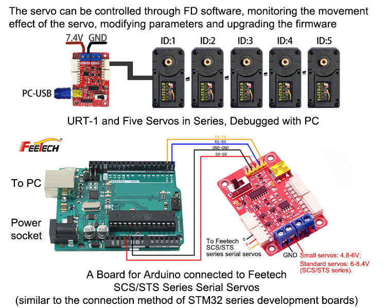 3. The characteristics of serial bus: one I/O port can connect multiple servos in series up and down to reduce the occupation of serial ports, and the wiring is simple and beautiful. Multiple servos are allowed in a bus control network, so each servo is assigned a unique ID number within the network. The control command issued by the controller contains the ID information. Only the servo that matches the ID number can receive this instruction and return the answer information.