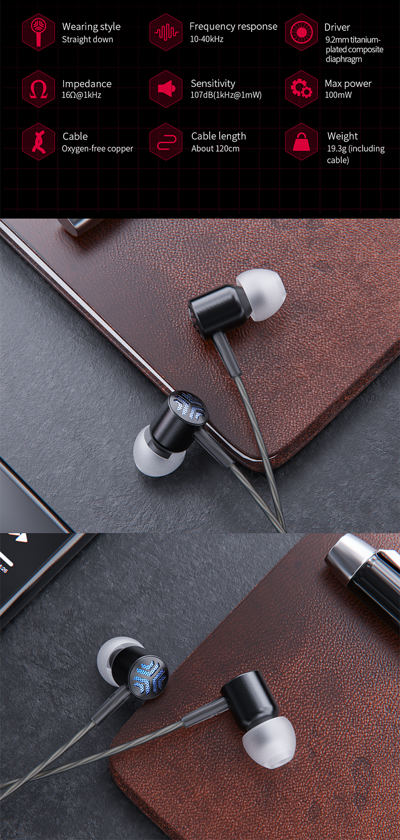 - Single earphone weight: 19.3g (included earphone wire)