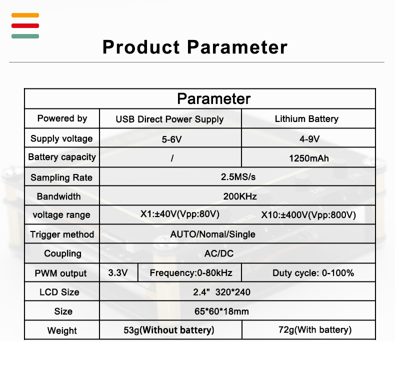 The oscilloscope has a real-time sampling rate of 2.5MS/s and a 200KHz bandwidth.