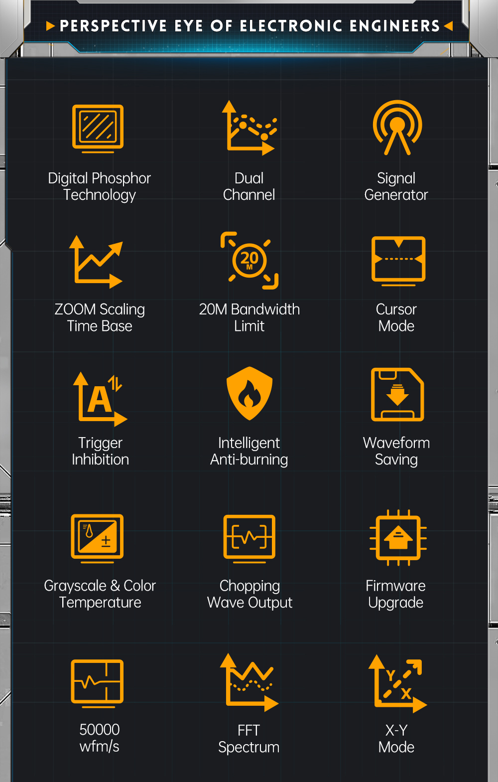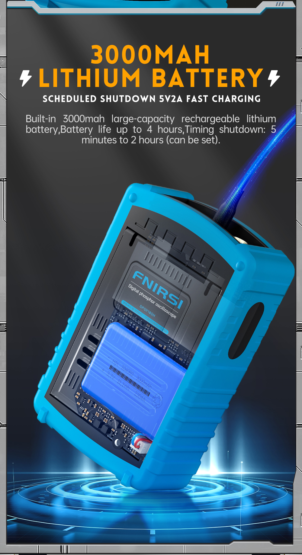The DDS signal generator has 14 kinds of function signal waveforms and a free-customized chopping waveform. The frequency of the sine wave can reach 20MHz, and the other waveforms can reach 10MHz. The original chopping output function can store up to 500 customized signals. It has three time base modes of YT, XY and rolling. Manual cursor measurement is suitable for measurements with large noise signals. Efficient one-button automatic adjustment, adaptive 25%, 50%, 75% electric level trigger, it only takes 2 seconds to measure 1VPP/1KHz. Save waveforms and screenshots with one key, up to 250 sets of waveform data or 90 pictures can be stored, and 500 intercepted wave data can be stored at the same time. The data browser can browse and view the currently saved waveform data and pictures, and the waveform data supports operations such as zooming and moving. High voltage anti-burning protection, all gears can withstand high voltage up to 400V. USB data export and you can connect it to a computer to copy picture files, and you can also copy system files to the oscilloscope for system upgrades. 5V 2A fast charging and 1 hour can charge to 80%.