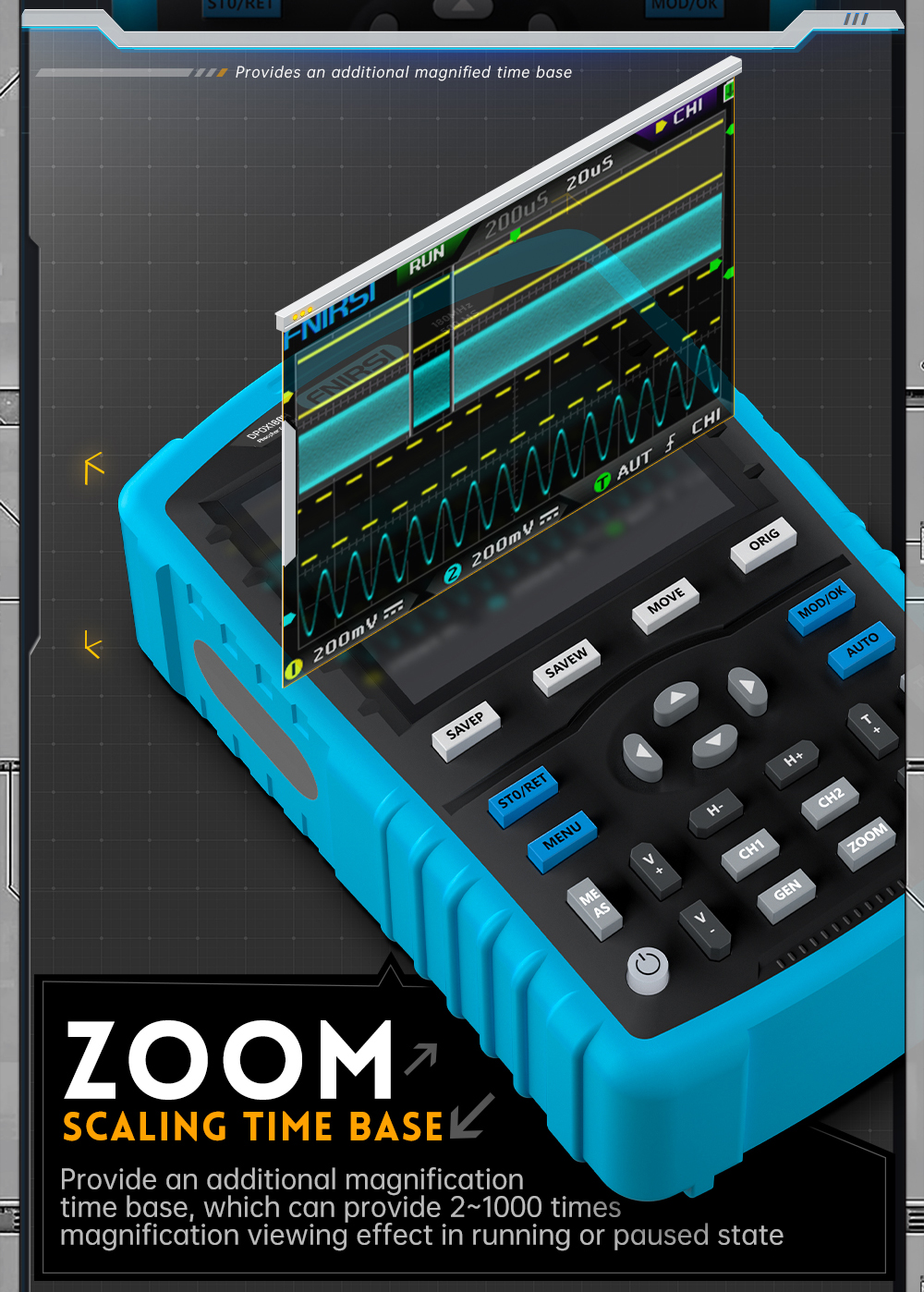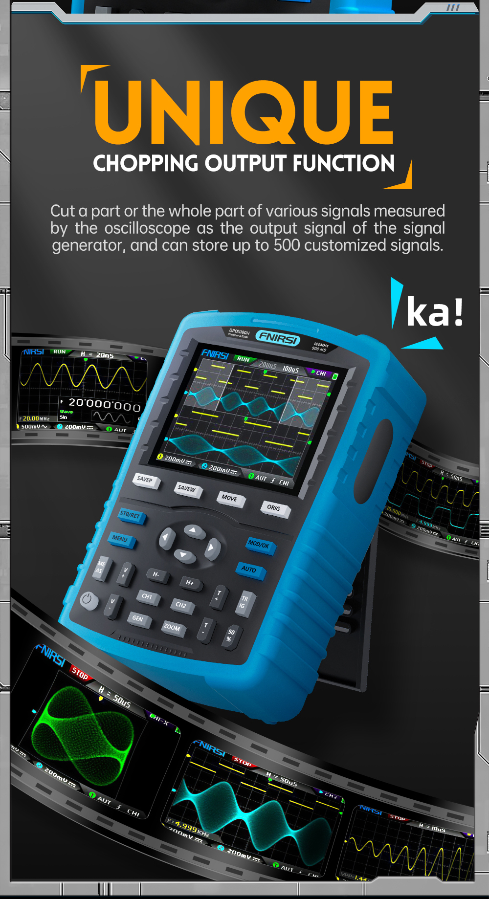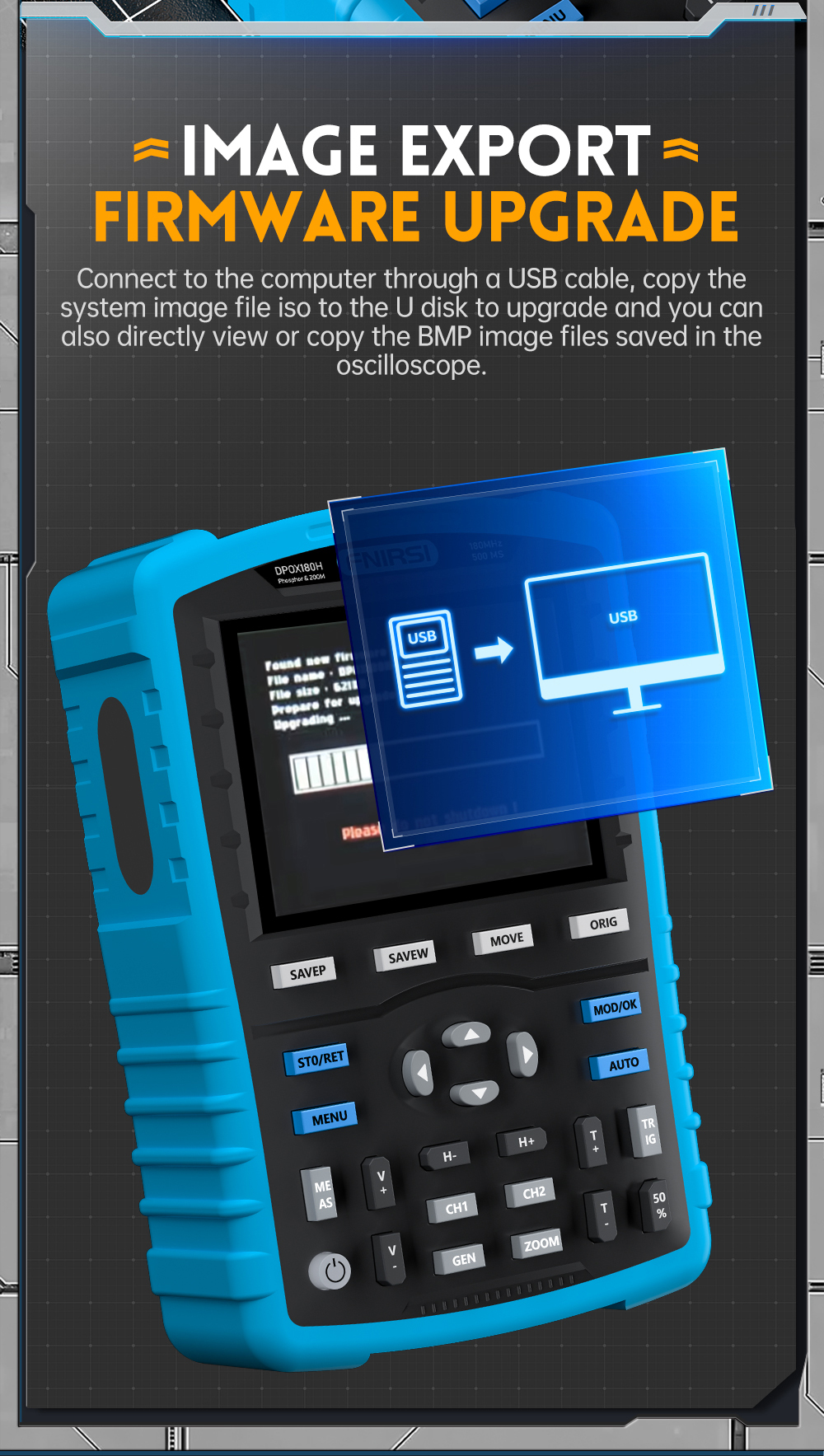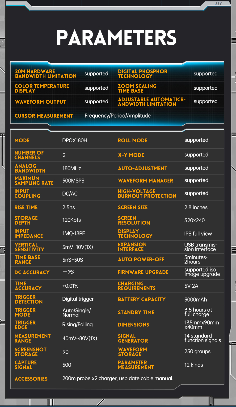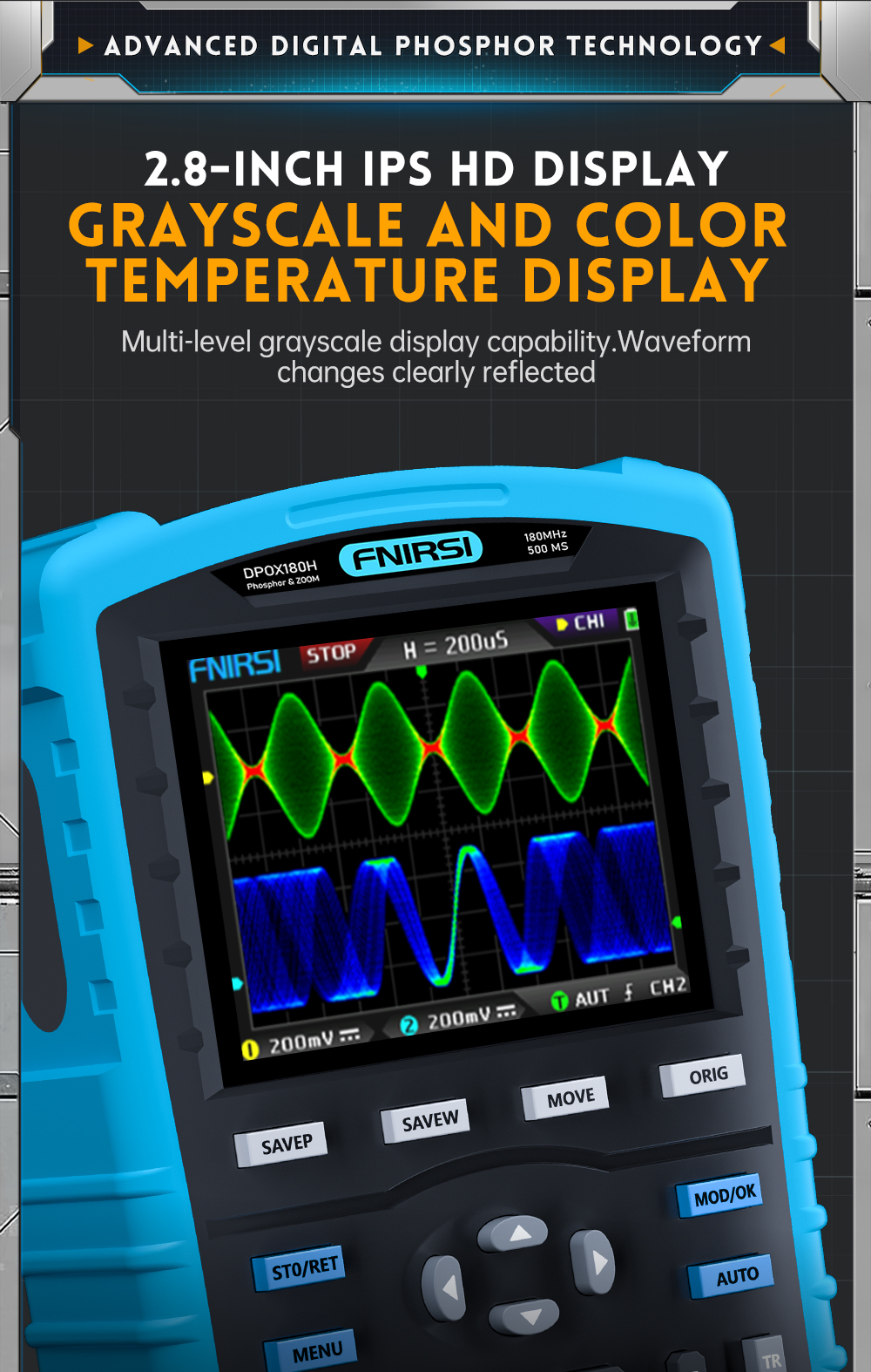 DPOX180H is a cost-effective handheld dual-channel digital phosphor oscilloscope and signal generator.