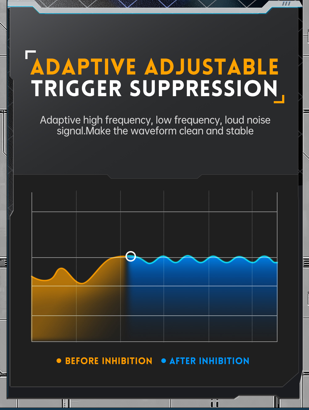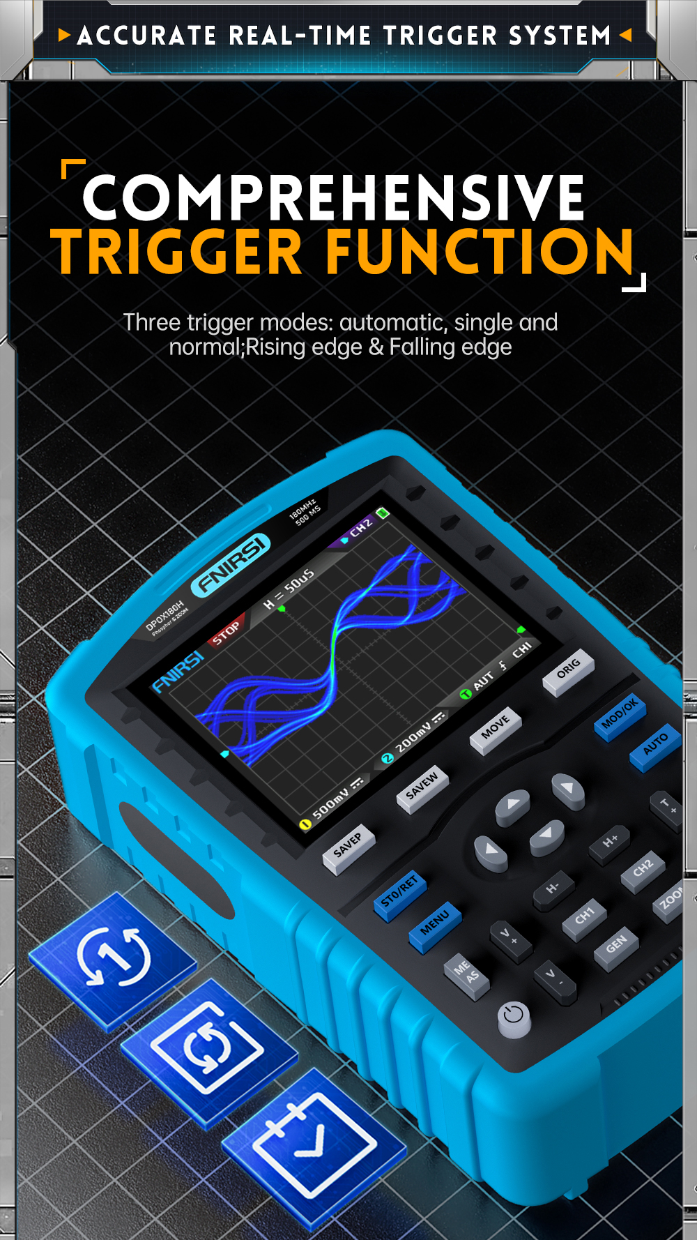 The oscilloscope has a real-time sampling rate of 500MSPS and an analog bandwidth of 180MHz. In terms of display, a high-contrast 2.8-inch IPS full-vision LCD screen and digital fluorescent technology are used. The waveform display effect is good, and the color ways are grayscale and color temperature. With a waveform refresh rate of up to 50000wfm/s, it is easier to display abnormal signals with low probability. The time base system includes a ZOOM time base for easy analysis of digital protocol signals. With a vertical sensitivity as low as 5mV, it can better measure small signals of 5mVPP. Ultra-high signal-to-noise ratio, fully sealed shielding measures, stable circuit feedback design and clean and clear waveform. The original adjustable automatic bandwidth limit and adaptive adjustable trigger suppression are suitable for analyzing and measuring signals with relatively large noise. 20M hardware bandwidth limit can filter out noise above 20MHz. The trigger adopts digital trigger technology with high precision. It has three trigger modes: automatic/single/normal. It has a strong ability to collect periodic signals, burst signals and protocol signals.