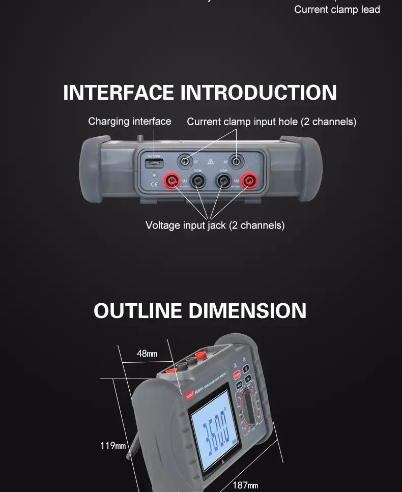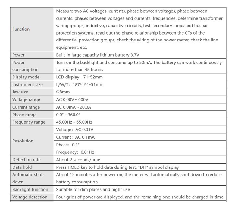 - Digital double clamp phase volt-ammeter is the latest product of our company's clamp-type meter series. It is a hand-held, dual-channel input all-digital, multi-function, high-precision measurement instrument.The instrument uses the latest microprocessor technology and digital signal processing technology to achieve power frequency measurement (such as voltage, current RMS, power frequency, phase relationship, etc.), Determine the transformer wiring group, inductive, capacitive circuit, test the secondary circuit and bus differential protection system, read out the phase relationship between the differential protection CT groups, check the power meter wiring is correct or not,the meter uses the clamp-type current transformer conversion method to input the measured current, so there is no need to disconnect the circuit under test. Provide a safe, accurate, and convenient new type of power meter for electricity inspection personnel.