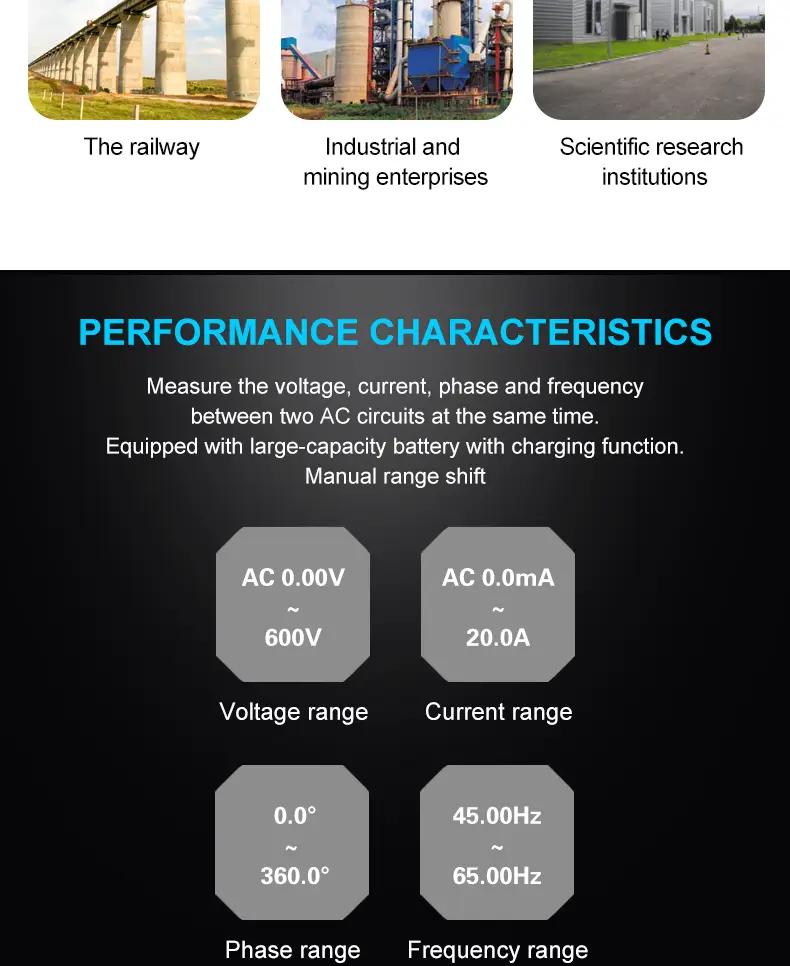 - Digital double clamp phase volt-ammeter is suitable for electric power, petrochemical, metallurgy, railway, industrial and mining enterprises, scientific research institutions, and measurement departments. Especially suitable for energy billing systems and relay protection systems.