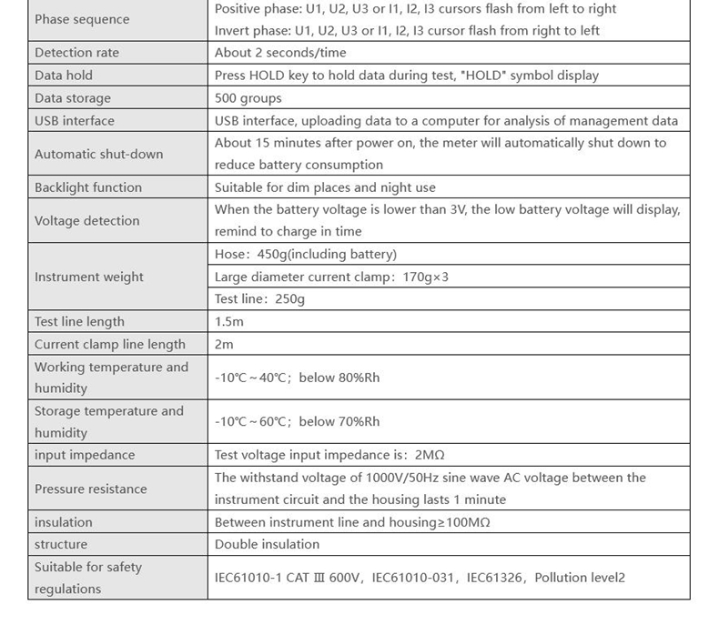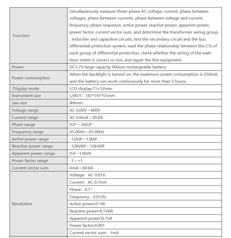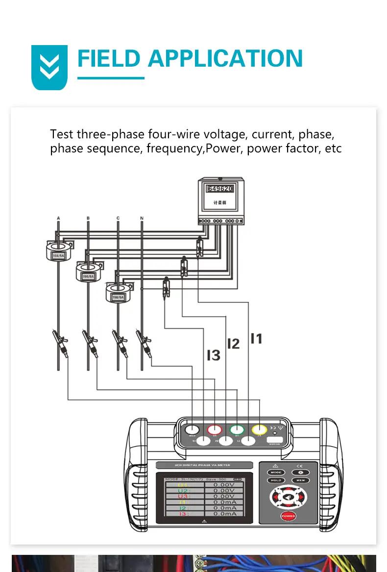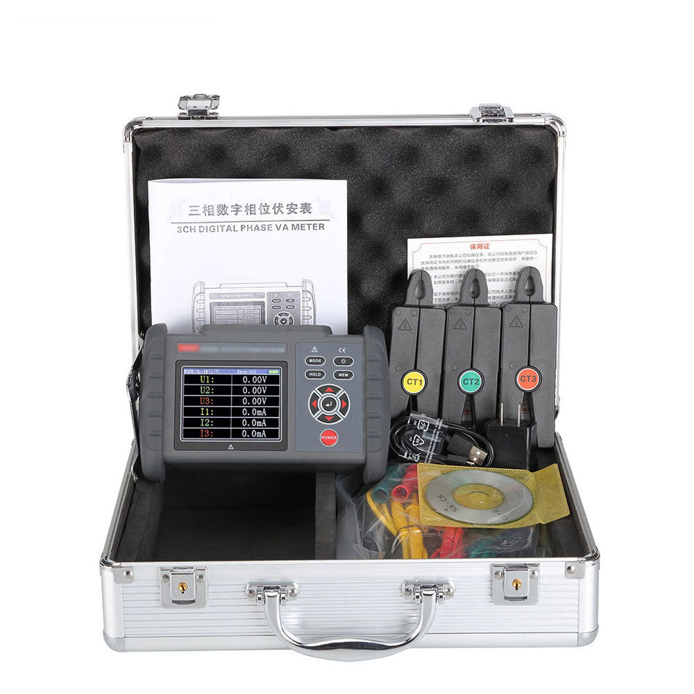 - Three-phase digital phase volt-ammeter is the latest product of our company's clamp-type meter series. The instrument is a fully digital, multi-function, high-precision, intelligent multi-parameter frequency measurement instrument. The instrument uses the latest microprocessor technology and digital signal processing technology to achieve power frequency measurement (such as voltage, current RMS, active power, reactive power, apparent power, power frequency, power factor, phase relationship, etc.), determine the transformer wiring group, inductive, capacitive circuit, test the secondary circuit and bus differential protection system, read out the phase relationship between the differential protection CT groups, check the power meter wiring is correct or not, the meter uses the clamp-type current transformer conversion method to input the measured current, so there is no need to disconnect the circuit under test. Provide a safe, accurate, and convenient new type of power meter for electricity inspection personnel.