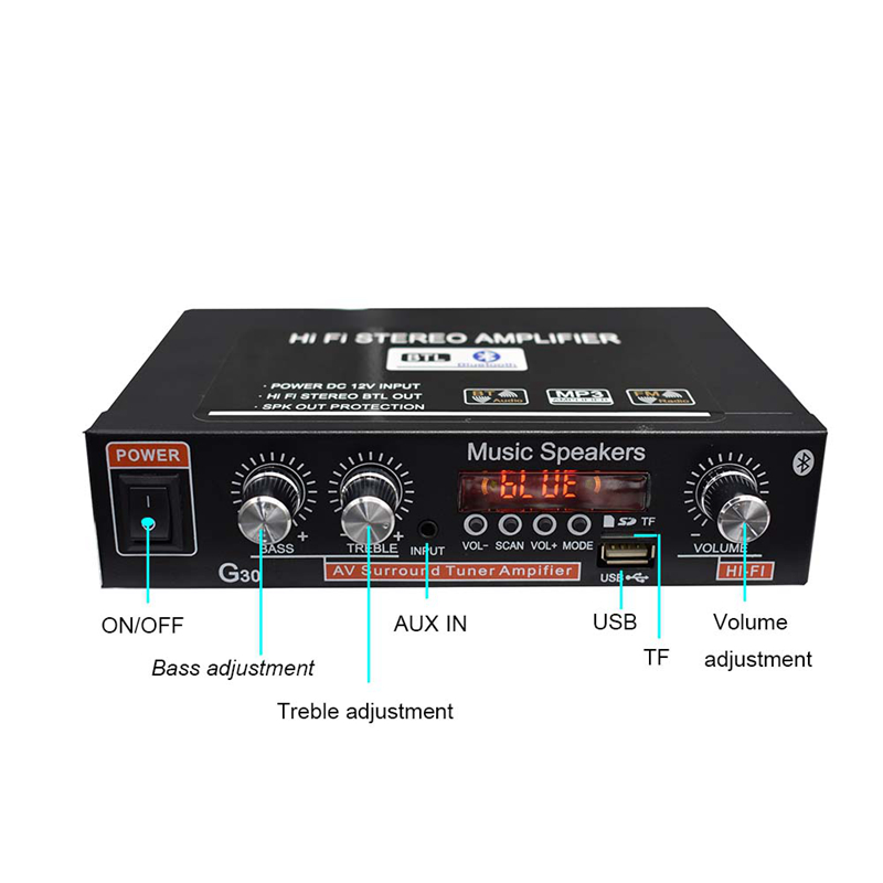 G30 12V Car Amplifier 2 Channel Bluetooth Power Amp Peak Power 180W+180W w/ Remote Controller