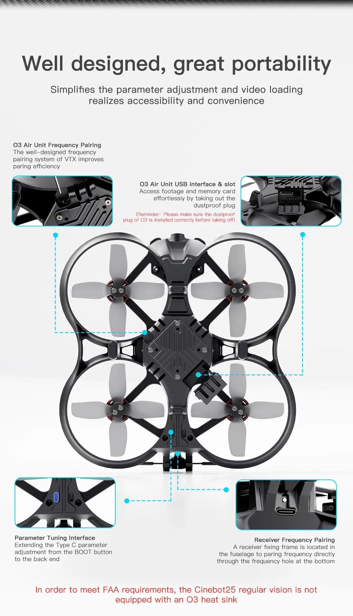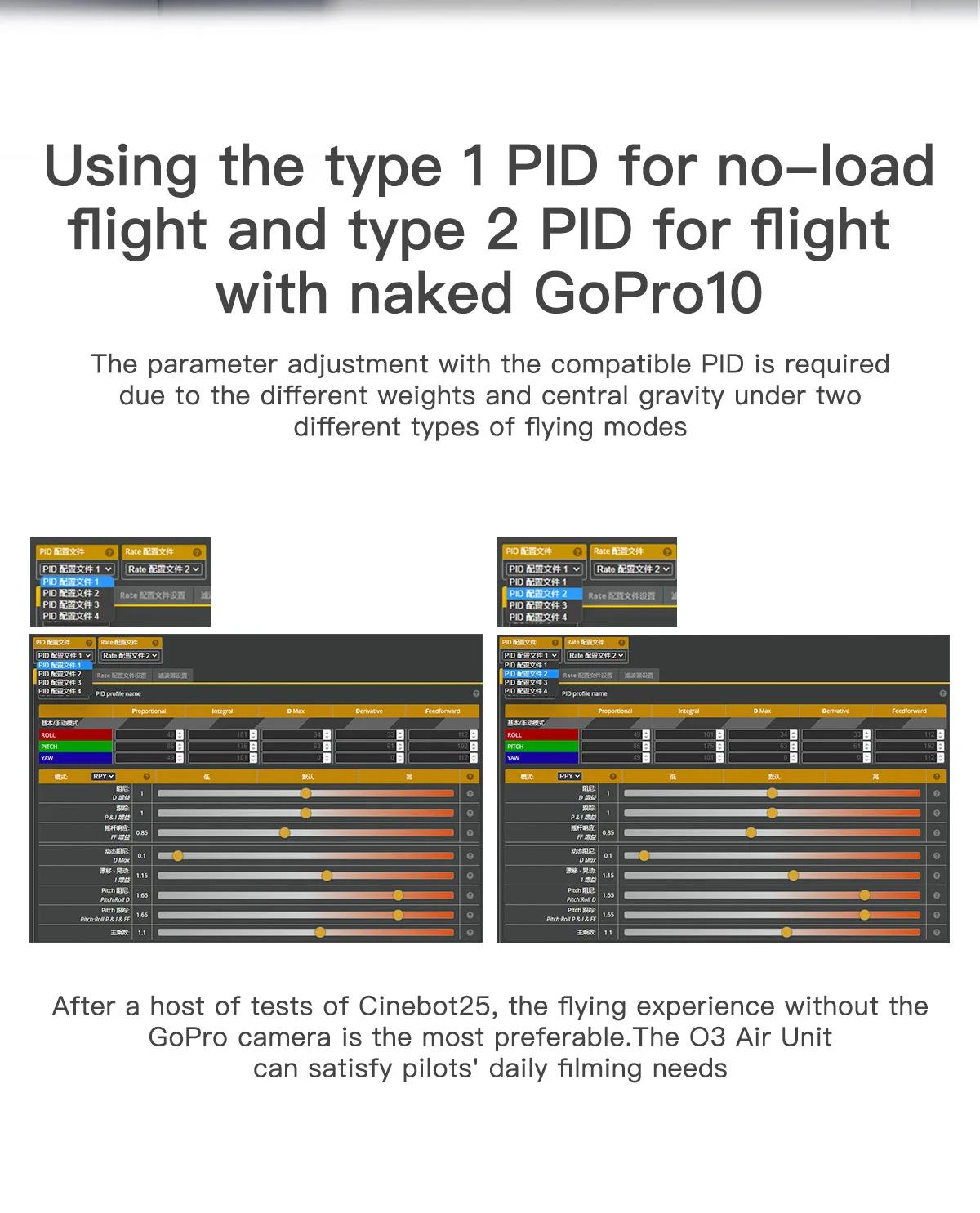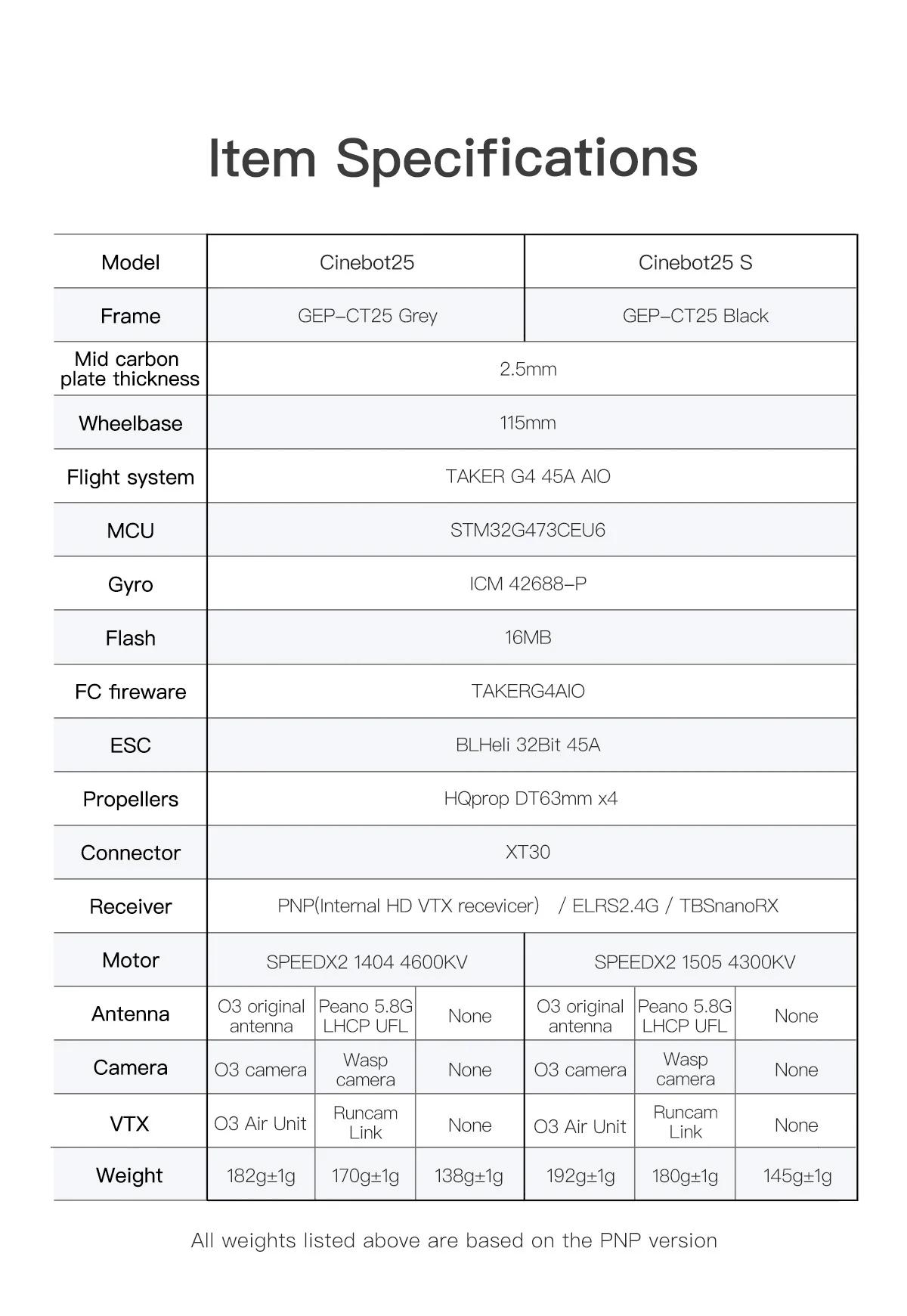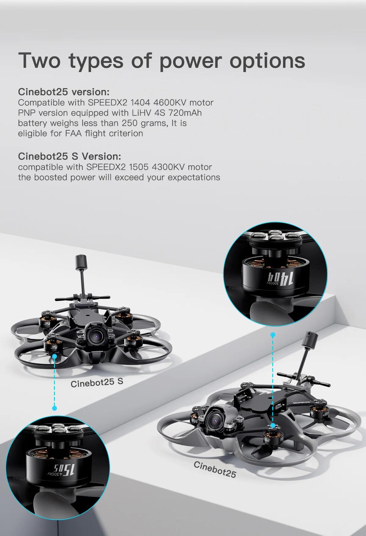 - Cinebot25 comes with two different options for the power version. They are the regular version with the SPEEDX2 1404 motor and the S(sport) version with the SPEEDX2 1505 motor.