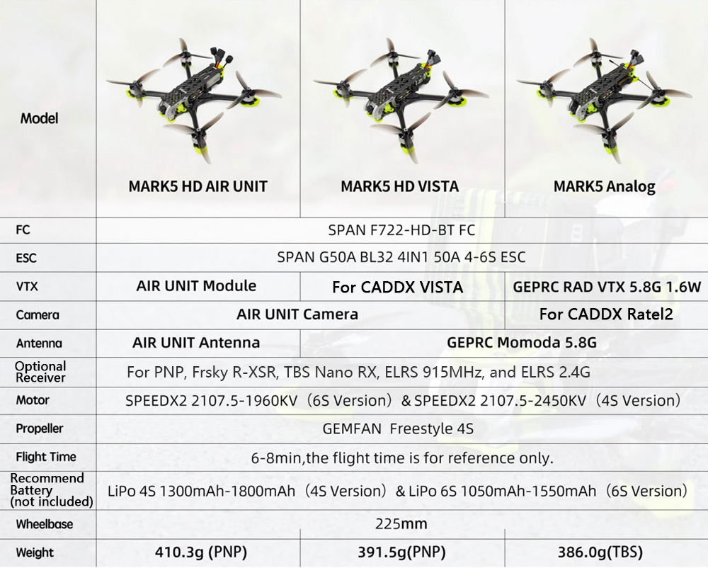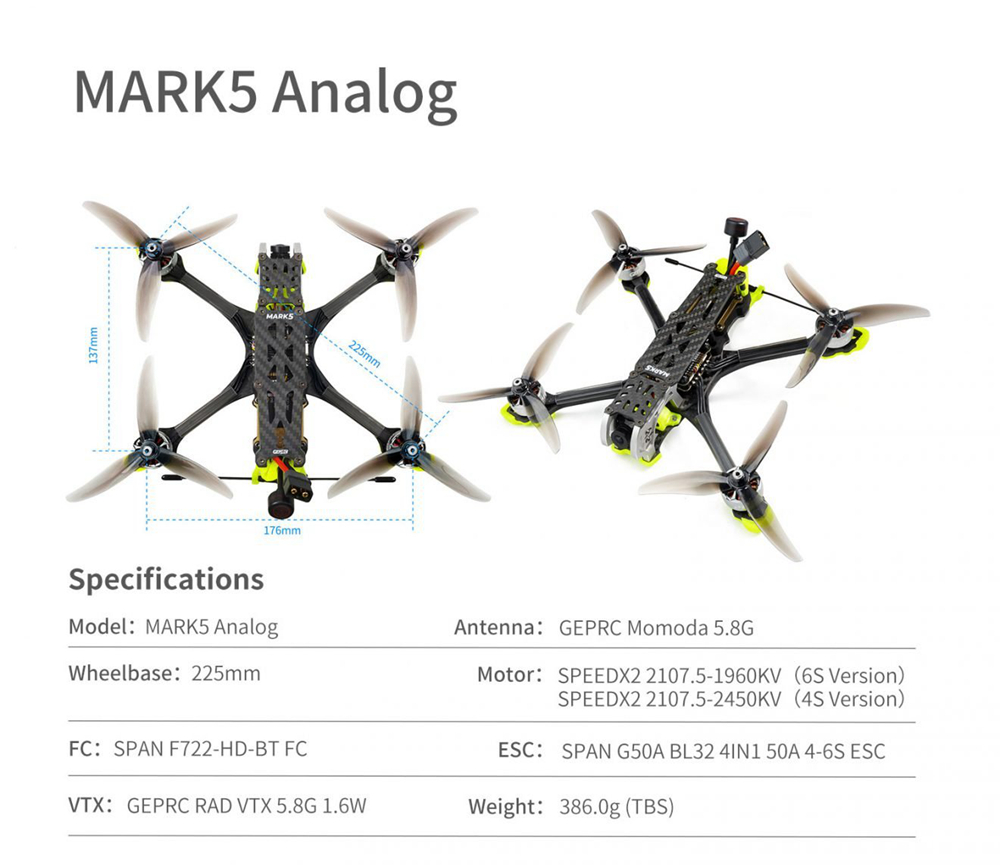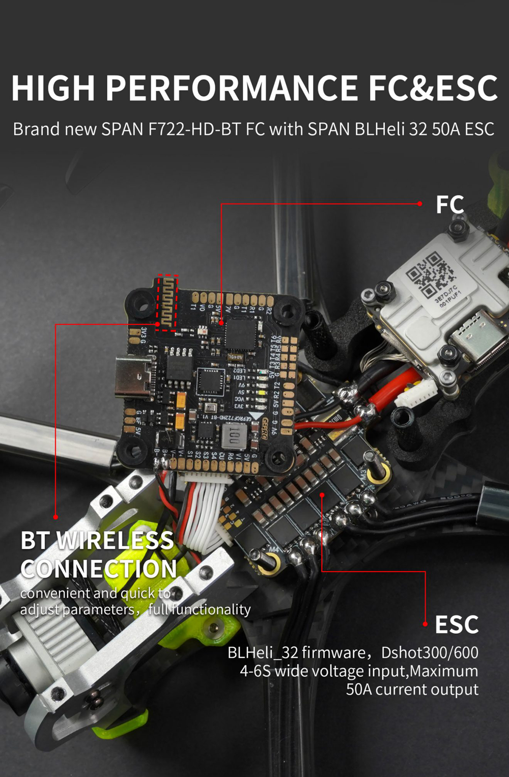 endurance. MARK5 is equipped with GEPRC's latest SPAN F722-HD-BT FC with