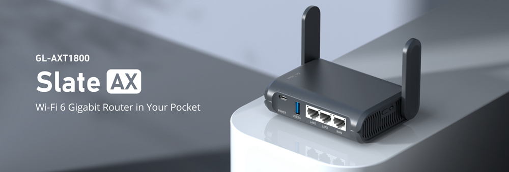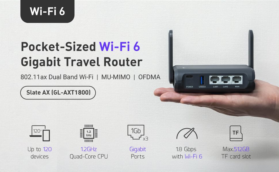 - Wi-Fi 6 Travel Router: Slate AX (GL-AXT1800) is our first Wi-Fi 6 travel router that comes with IPQ6000 1.2GHz quad-core processor. With the latest Wi-Fi 6 technology, you can enjoy more capacity for connected devices and faster wireless speed on the road or at home.