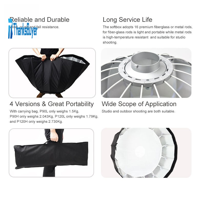 - Long service life: The softbox uses 16 fiberglass rods. The fiberglass rods boast better portability, more resistance to fall, and stronger resistance to wind and pressure