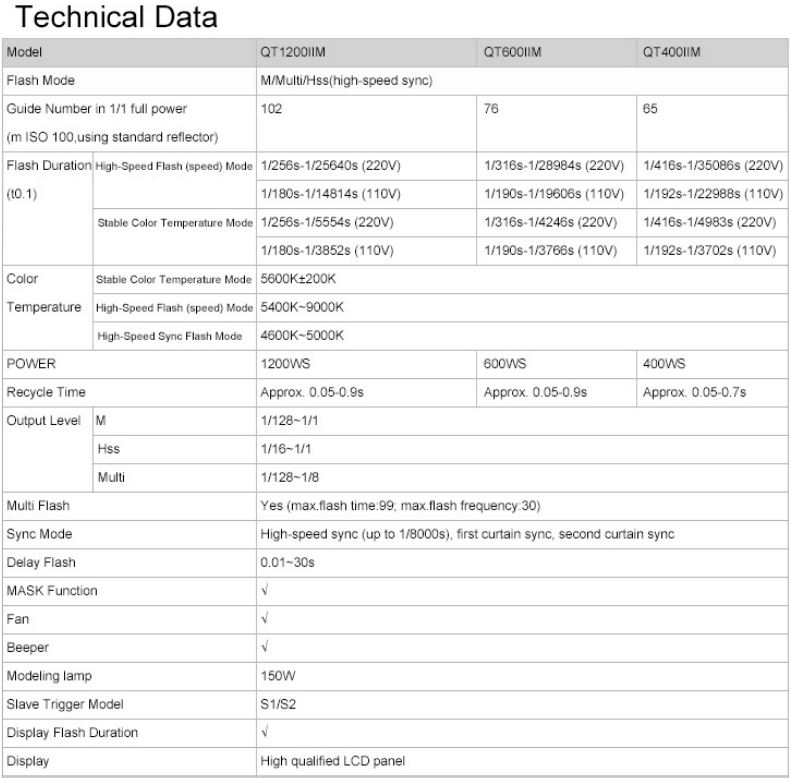 - As a high-speed studio flash, QTII has 0.05-0.9s extremely fast recycling time, 1/316-1/28984s