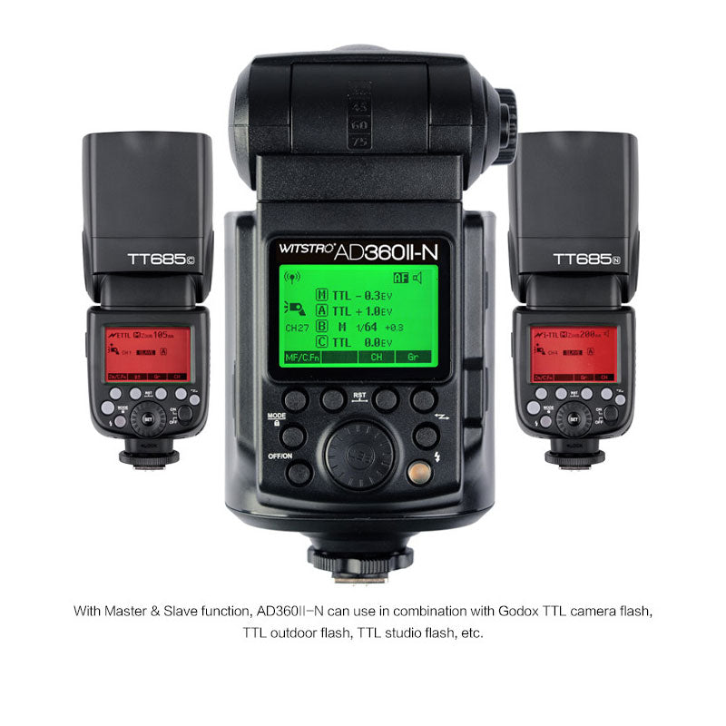 1. Built-in Godox 2.4G wireless X system, Compatible with multi camera brands: when used on the camera, AD360II-N is suitable for Nikon DSLR series camera; when using Godox 2.4G wireless X system off camera, AD3600II-N is for Canon E-TTL II autoflash, Nikon i-TTL autoflash, etc. With master & slave functions, AD360II-N can be also used in combination with Godox TTL camera flashes,TTL outdoor flashes, TTL studio flashes, etc. Workable as a Master or Slave unit in a wireless flash group