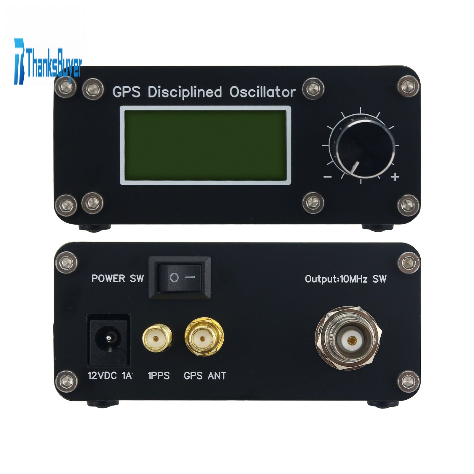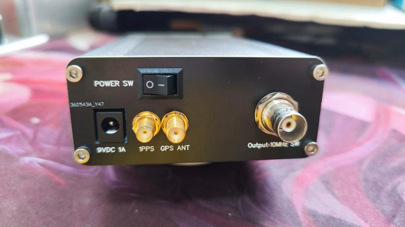 - The front panel has a display screen and encoder, while the rear panel has 10MHz output interface, 1PPS output interface, GPS antenna interface, power switch, and 12V DC power interface.