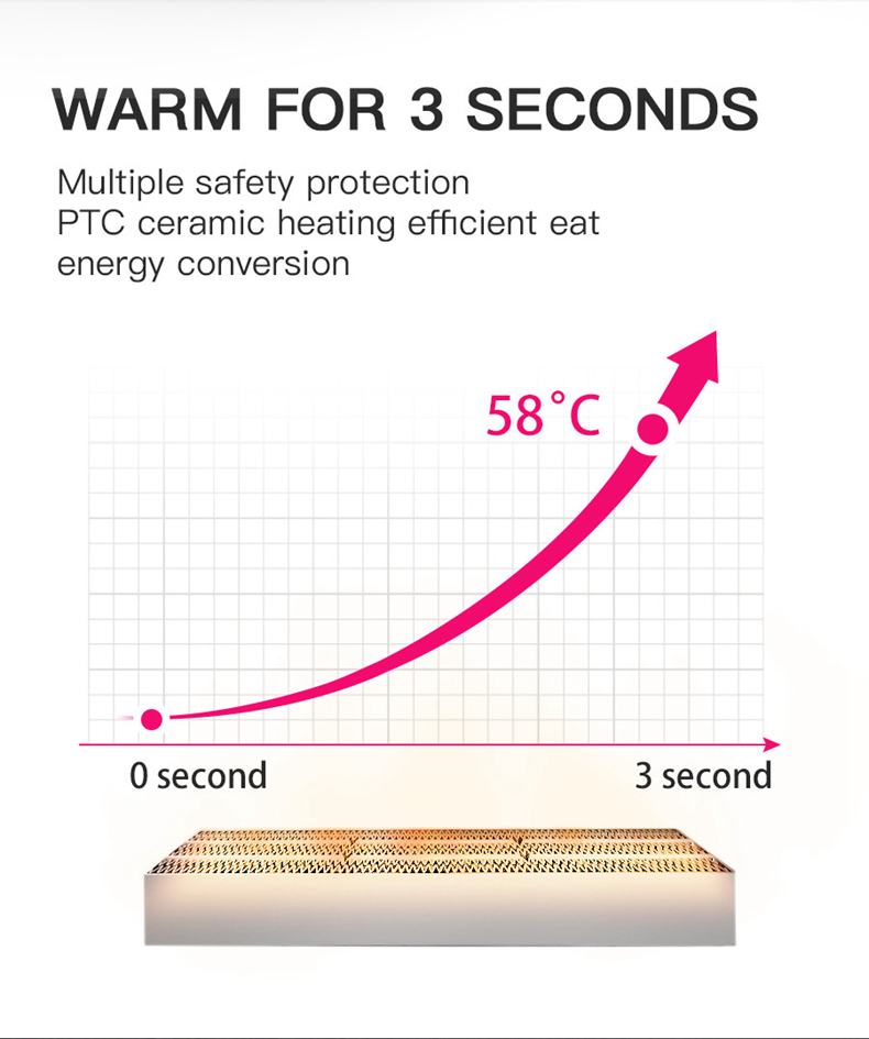 - Warm in 3 seconds. Using PTC ceramic heating element, heating up faster. At the same time, it is equipped with a turbo-type air duct design, low noise, no odor