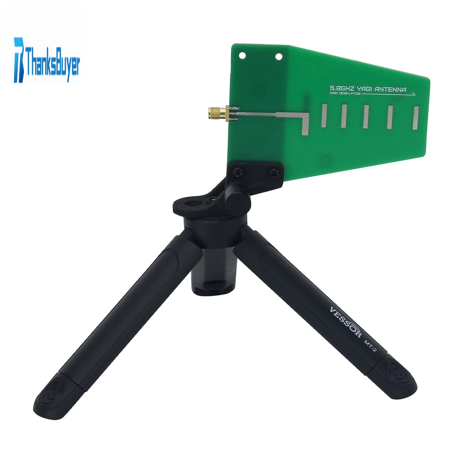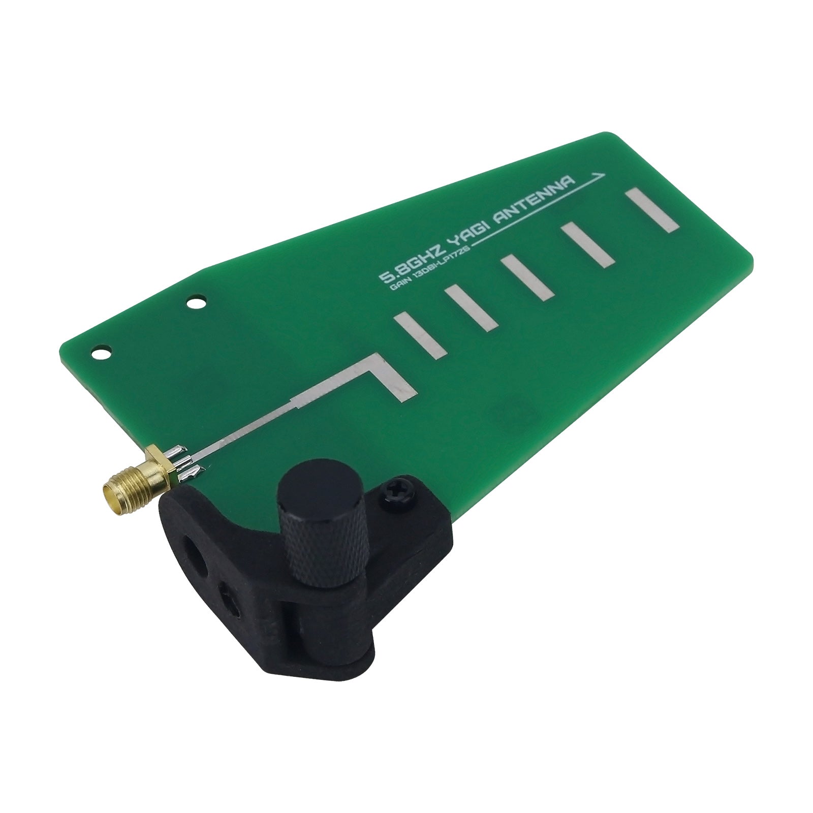 This is the HamGeek HG1726-5.8G directional antenna. The directional antenna features a handle that also functions as a tripod. Antenna elevation angle is adjustable via a locking nut.