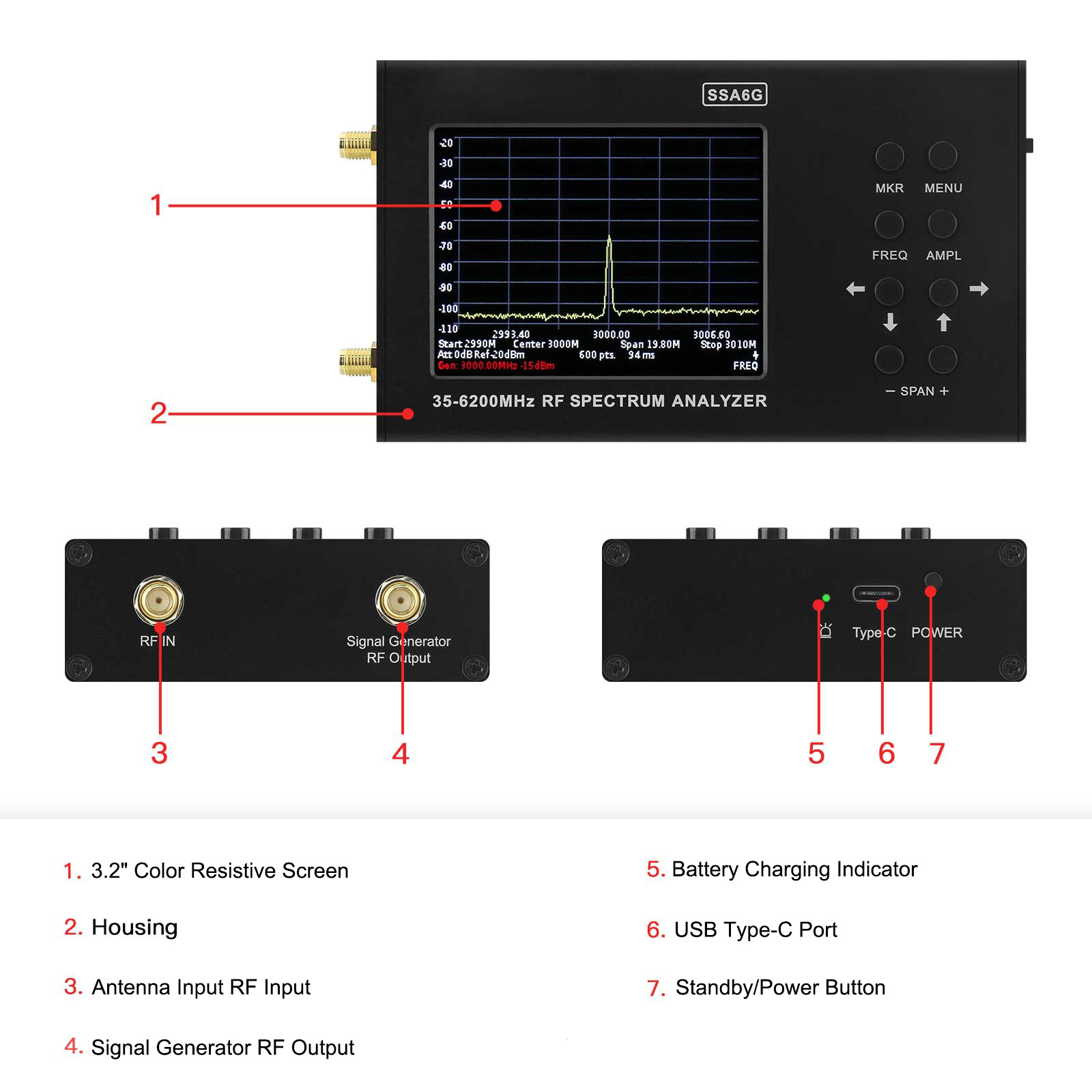 HAMGEEK SSA6G is a portable panoramic spectrum analyzer designed to display signal spectrum in the frequency range from 35MHz to 6200MHz. The analyzer finds the amplitude and frequency of spectral components of the analyzed process.