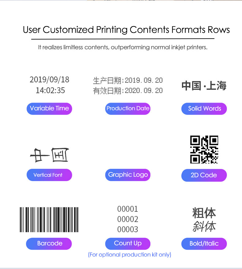 - Printed Content: Chinese, English, Number, Symbol, QR Code, Barcode, Graphics, Date, Time, etc.