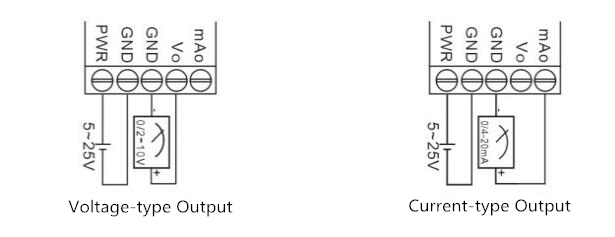 5. Voltage-type output load impedance requirements ≥2KΩ, current-type output impedance requirements ≤500Ω.