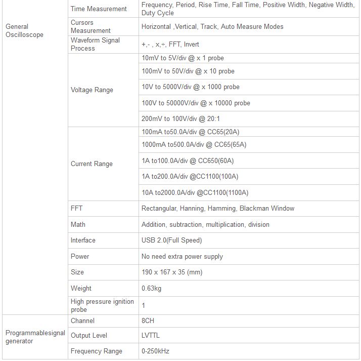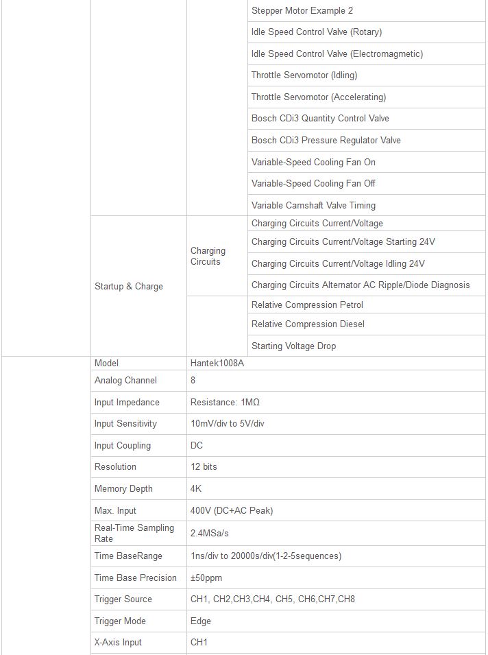 8-channel oscilloscope is designed for vehicle testing. It features over 80 types of automotive diagnostic functions (Ignition/Sensor/Bus detection/Perform/Starter and charging circuits etc.). Video Help Function provides the video help of diagnostic which can be watching online. The diagnostic result can be generated in diagnostic report, printed or taken screenshot by pushing one key, supporting many methods to save the data. Supports recording waveform for a long time. It can simulate camshaft and crankshaft signal. Transmit signals through USB 2.0 interface. Just plug and play, requiring no extra power supply.