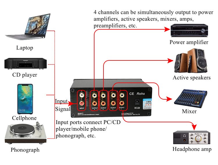 - Hifi audio splitter: 1CH input, 4CH simultaneous output