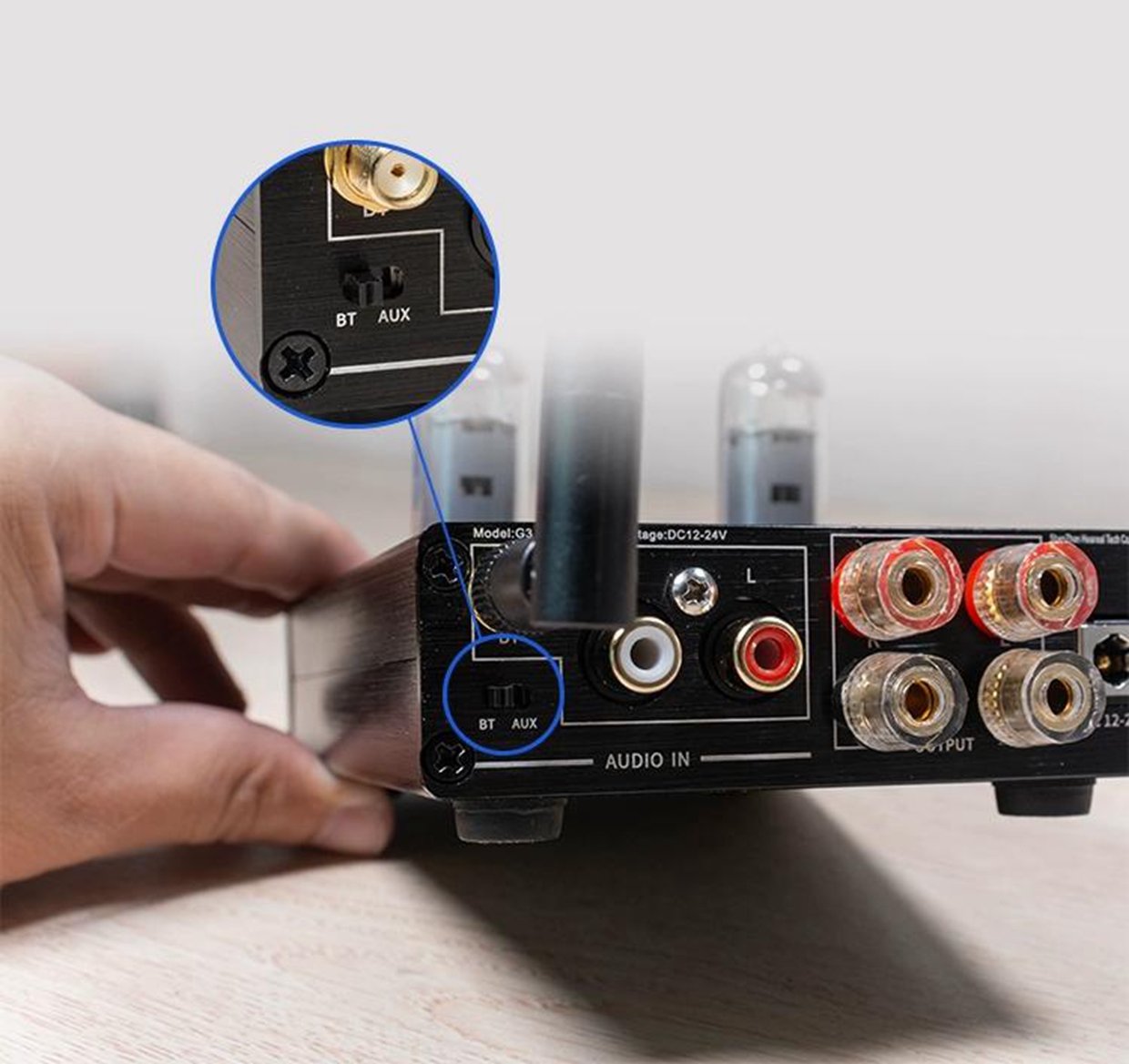 - Wired input + wireless Bluetooth input: QCC3031 Bluetooth 5.1 wireless input supports for aptx HD protocol, and provides better Bluetooth sound quality. It also supports AUX dual RCA inputs. The audio input mode can be manually switched via the BT/AUX switch on its back panel