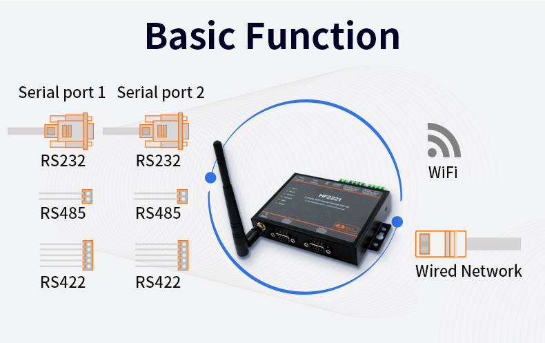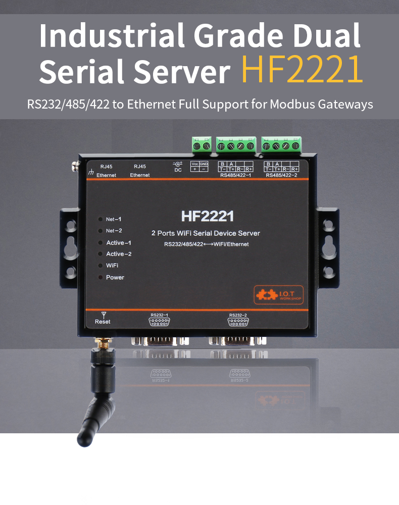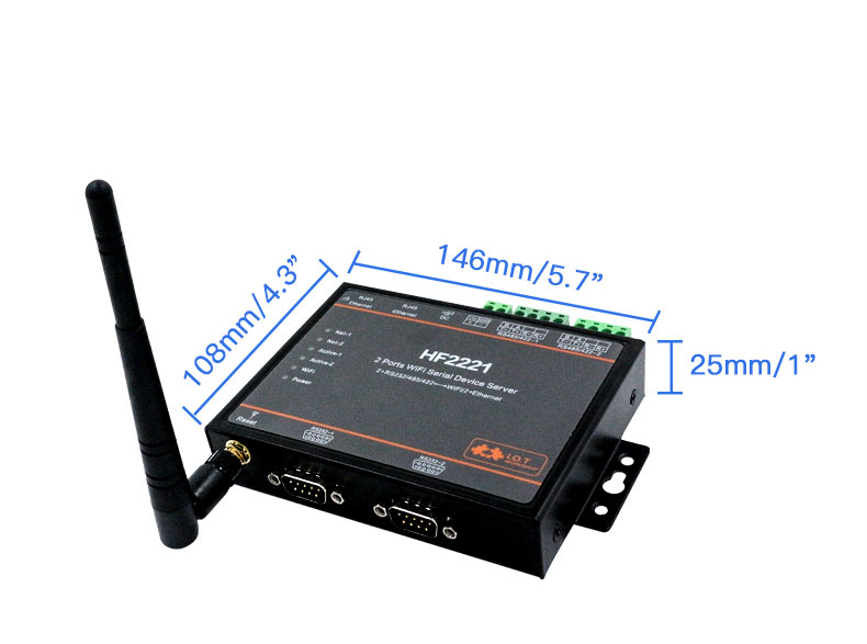 HF2221 Industrial Grade 2-Port Serial Server RS232/485/422 to Wifi/Ethernet w/ Rubber Wifi Antenna