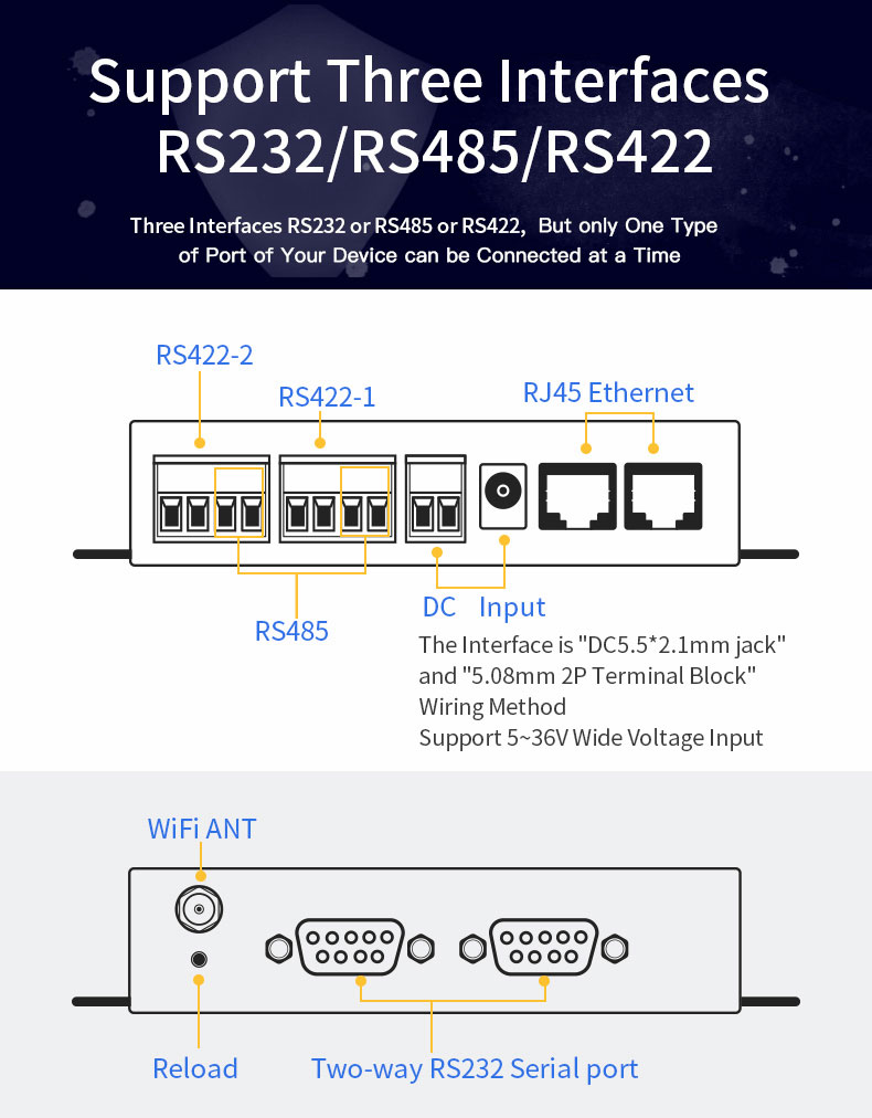 - RS232/RS485/RS422 to Ethernet (only one type of port of your device can be used at a time)