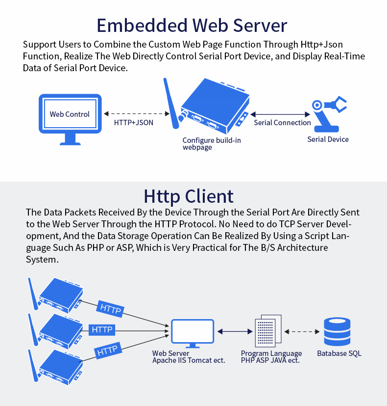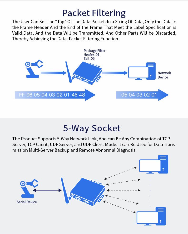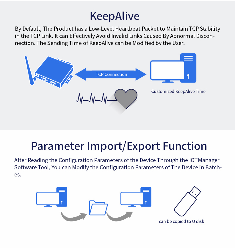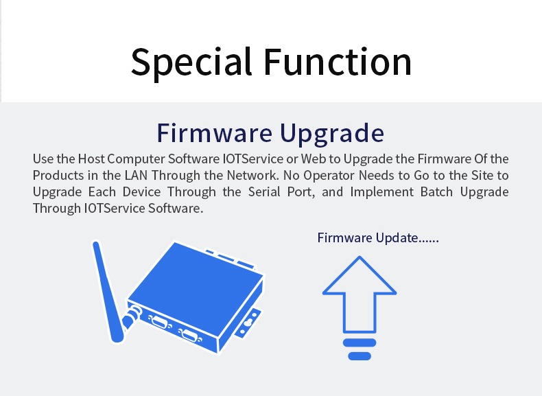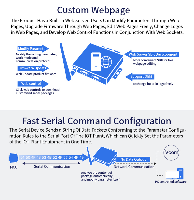 - Script secondary development; for Alibaba Studio platform; firmware upgrade; network remote upgrade firmware; custom subcontract function; custom webpage; fast serial command configuration; packet filtering; 5-way socket; embedded web server; Http client; for ModbusTCP protocol; KeepAlive; parameter import/export function; hardware enhanced protection