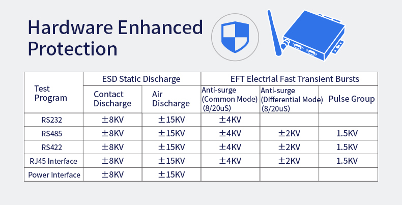 - Static electricity: 8KV contact discharge, 15KV air discharge; surge: differential mode 4KV, common mode 6KV