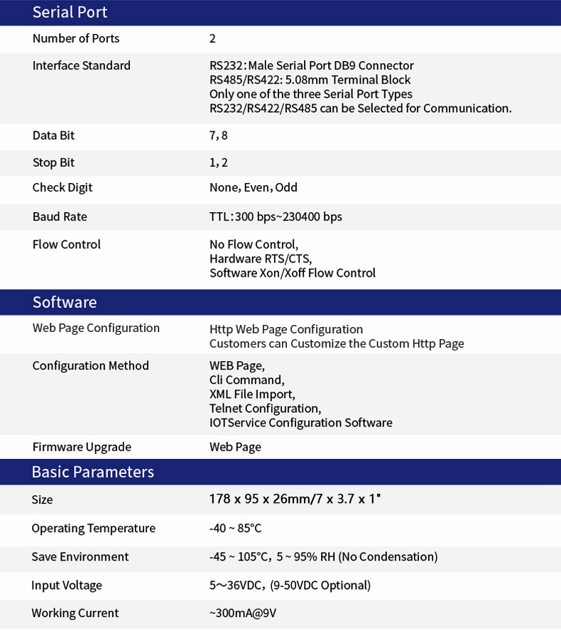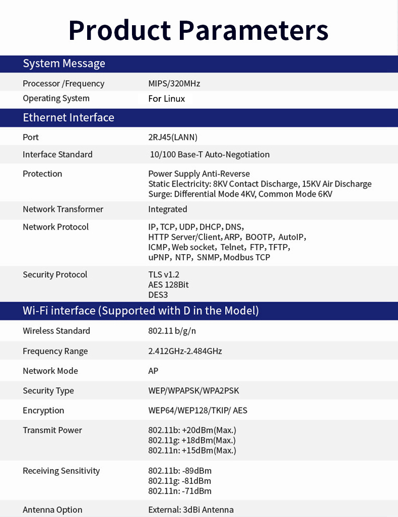- Support TCP/IP/Telnet/Modbus TCP Protocol, support TLS/AES/DES3 encryption