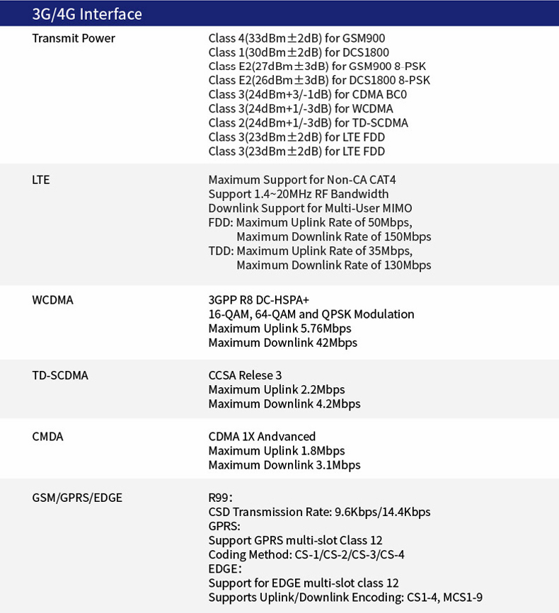- Support 4G/3G/GPRS, FDD-LTE, TDD-LTE, WCDMA, TD-SCDMA, CDMA2000, CDMA 1X/EVDO, GSM900/1800