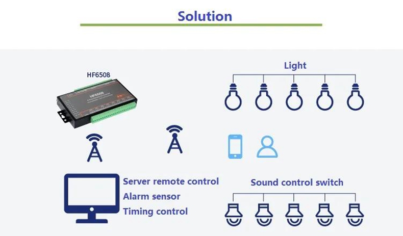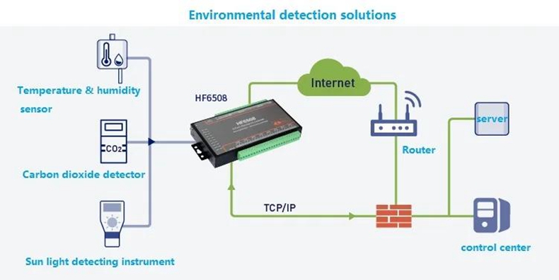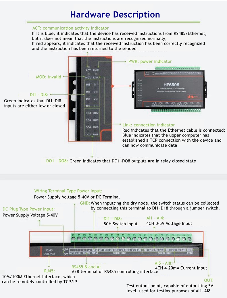 - HF6508 is a controller that uses Ethernet for remote input (DI), output (DO) control, and analog input (AI) acquisition. This product has added P2P functionality, allowing remote relay control, switch quantity collection, and analog quantity collection to be achieved anywhere through PC or mobile P2P software.