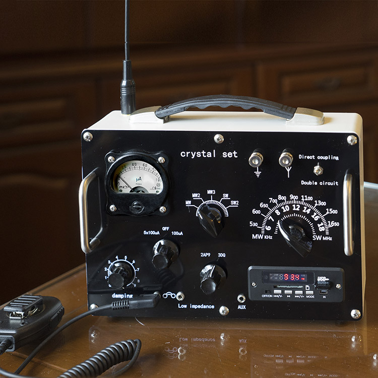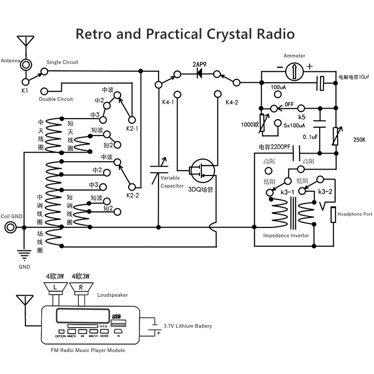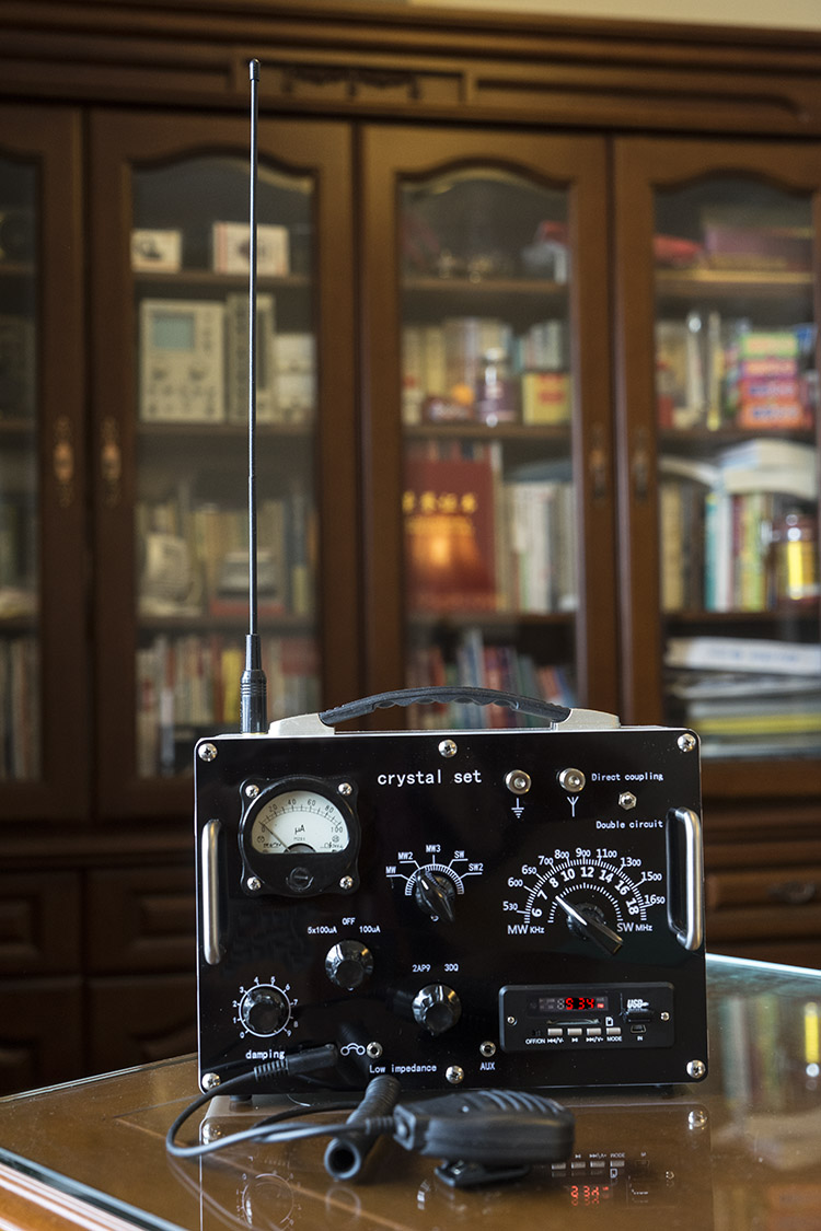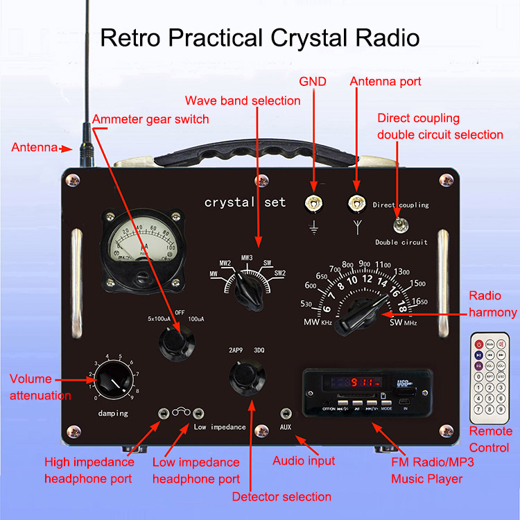 - Crystal radio adopts 3DQ and diode exchange, impedance exchange, ammeter shift, fir Benny circuit, direct coupling and double circuit exchange, medium and short wave, FM radio and MP3 music player module are implanted in the lower left corner, 18650 lithium battery, two 2-inch full frequency loudspeakers, and remote control. This machine won the third prize in the tenth competition of crystal radio forum.